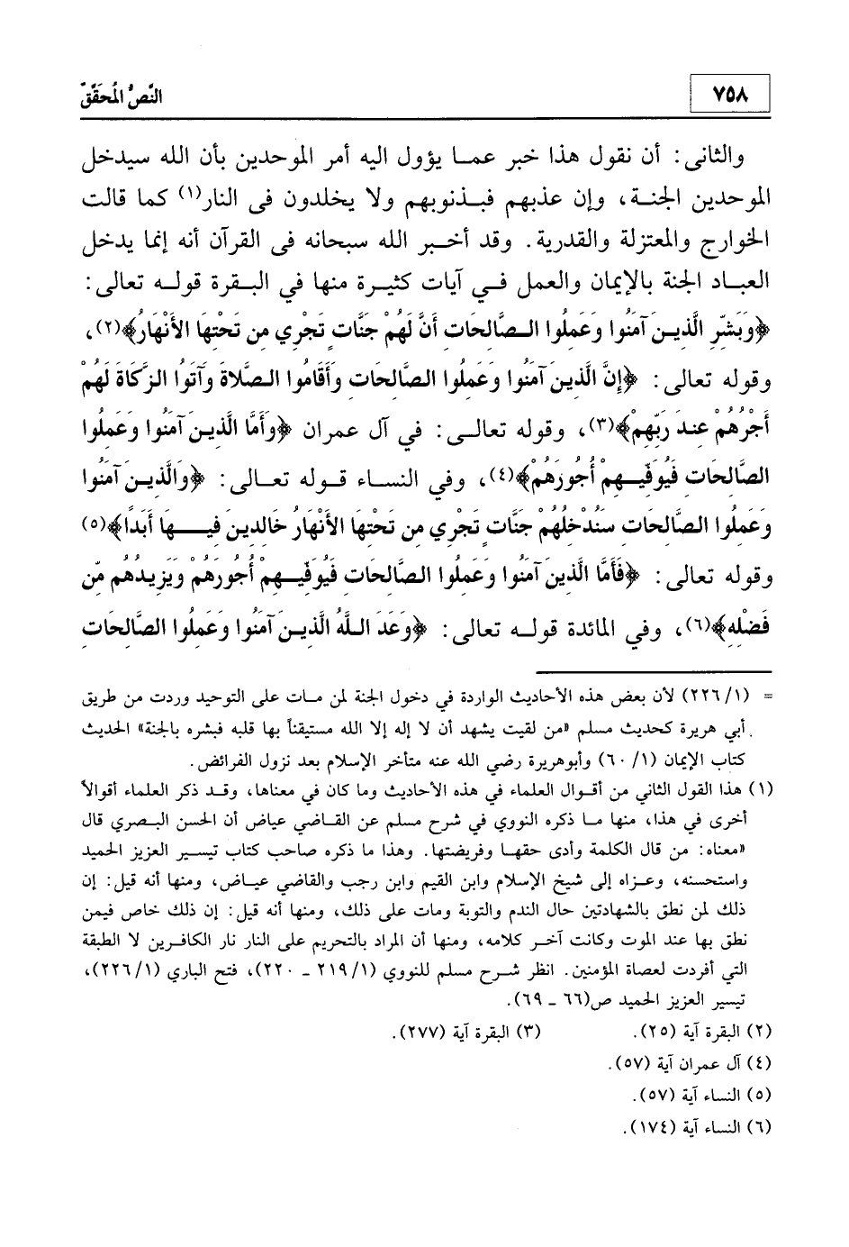 والثاني: أن نقول هذا خبر عما يؤول إليه أمر الموحدين بأن الله سيدخل الموحدين الجنة، وإن عذبهم فبذنوبهم ولا يخلدون في النار1 كما قالت الخوارج والمعتزلة والقدرية. وقد أخبر الله سبحانه في القرآن أنه إنما يدخل العباد الجنة بالإيمان والعمل في آيات كثيرة منها في البقرة قوله تعالى: {وَبَشِّرِ الَّذِينَ آمَنُوا وَعَمِلُوا الصَّالِحَاتِ أَنَّ لَهُمْ جَنَّاتٍ تَجْرِي مِنْ تَحْتِهَا الأنْهَارُ} 2، وقوله تعالى: {إِنَّ الَّذِينَ آمَنُوا وَعَمِلُوا الصَّالِحَاتِ وَأَقَامُوا الصَّلاةَ وَآتَوُا الزَّكَاةَ لَهُمْ أَجْرُهُمْ عِنْدَ رَبِّهِمْ} 3 وقوله تعالى في آل عمران: {وَأَمَّا الَّذِينَ آمَنُوا وَعَمِلُوا الصَّالِحَاتِ فَيُوَفِّيهِمْ أُجُورَهُمْ} 4، وفي النساء قوله تعالى: {وَالَّذِينَ آمَنُوا وَعَمِلُوا الصَّالِحَاتِ سَنُدْخِلُهُمْ جَنَّاتٍ تَجْرِي مِنْ تَحْتِهَا الأنْهَارُ خَالِدِينَ فِيهَا أَبَداً} 5 وقوله تعالى: {فَأَمَّا الَّذِينَ آمَنُوا وَعَمِلُوا الصَّالِحَاتِ فَيُوَفِّيهِمْ أُجُورَهُمْ وَيَزِيدُهُمْ مِنْ فَضْلِهِ} 6، وفي المائدة قوله تعالى: {وَعَدَ اللَّهُ الَّذِينَ آمَنُوا وَعَمِلُوا الصَّالِحَاتِ