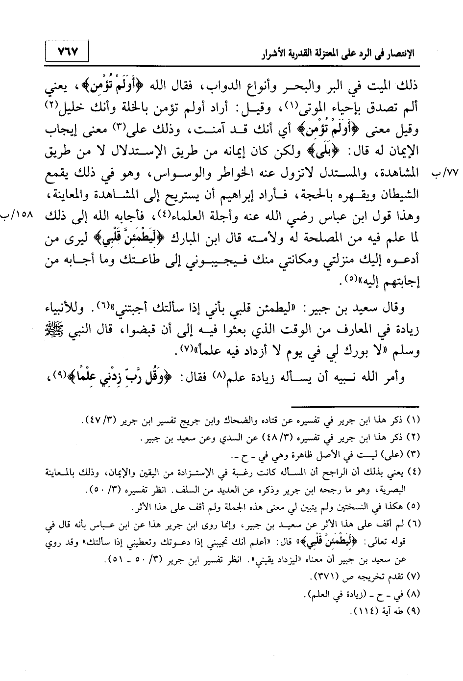 6 لم أقف على هذا الأثر عن سعيد بن جبير، وإنما روى ابن جرير هذا عن ابن عباس بأنه قال في قوله تعالى: {لِيَطْمَئِنَّ قَلْبِي} قال: "أعلم أنك تجيبني إذا دعوتك وتعطيني إذا سألتك" وقد روي عن سعيد بن جبير أن معناه "ليزداد يقيني". انظر: تفسير ابن جرير 3/50 - 51.