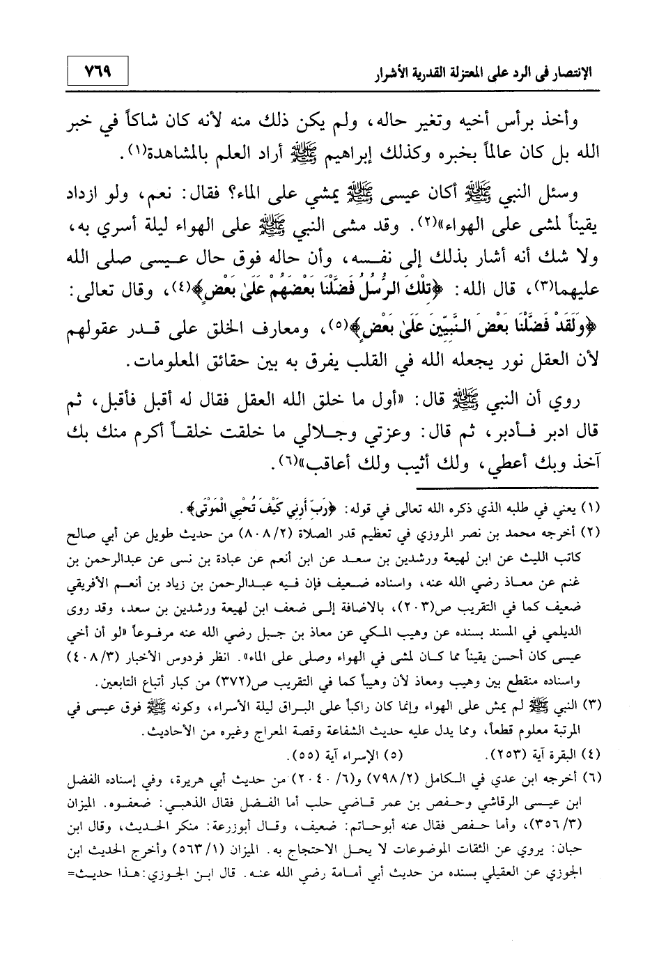 وسئل النبي صلى الله عليه وسلم أكان عيسى صلى الله عليه وسلم يمشي على الماء؟ فقال: "نعم، ولو ازداد يقيناً لمشى على الهواء"2 وقد مشى النبي صلى الله عليه وسلم على الهواء ليلة أسري به، ولا شك أنه أشار بذلك إلى نفسه، وأن حاله فوق حال عيسى صلى الله عليهما3، قال الله: {تِلْكَ الرُّسُلُ فَضَّلْنَا بَعْضَهُمْ عَلَى بَعْضٍ} 4، وقال تعالى: {وَلَقَدْ فَضَّلْنَا بَعْضَ النَّبِيِّينَ عَلَى بَعْضٍ} 5، ومعارف الخلق على قدر عقولهم لأن العقل نور يجعله الله في القلب يفرق به بين حقائق المعلومات.