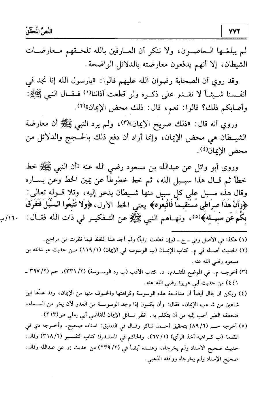 4 ويمكن أن يقال أن مدافعة هذه الوسوسة وكراهتها والخوف منها من الإيمان، وقد عدّها ابن شاهين من شعب الإيمان، فقال وأن يكون إذا وجد الوسوسة من العدو لأن يخر من السماء، فتخطفه الطير أحب إليه من أن يتكلم به. انظر: مسائل الإيمان للقاضي أبي يعلى ص 213.