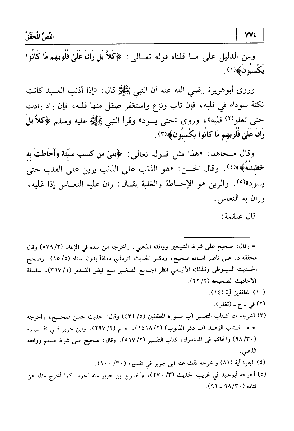 3 أخرجه ت كتاب التفسير (ب سورة المطففين 5/434 وقال: "حديث حسن صحيح"، وأخرجه جه. كتاب الزهد (ب ذكر الذنوب) 2/1418، حم 2/297، وابن جرير في تفسيره 30/98 والحاكم في المستدرك، كتاب التفسير 2/517. وقال: "صحيح على شرط مسلم" ووافقه الذهبي.