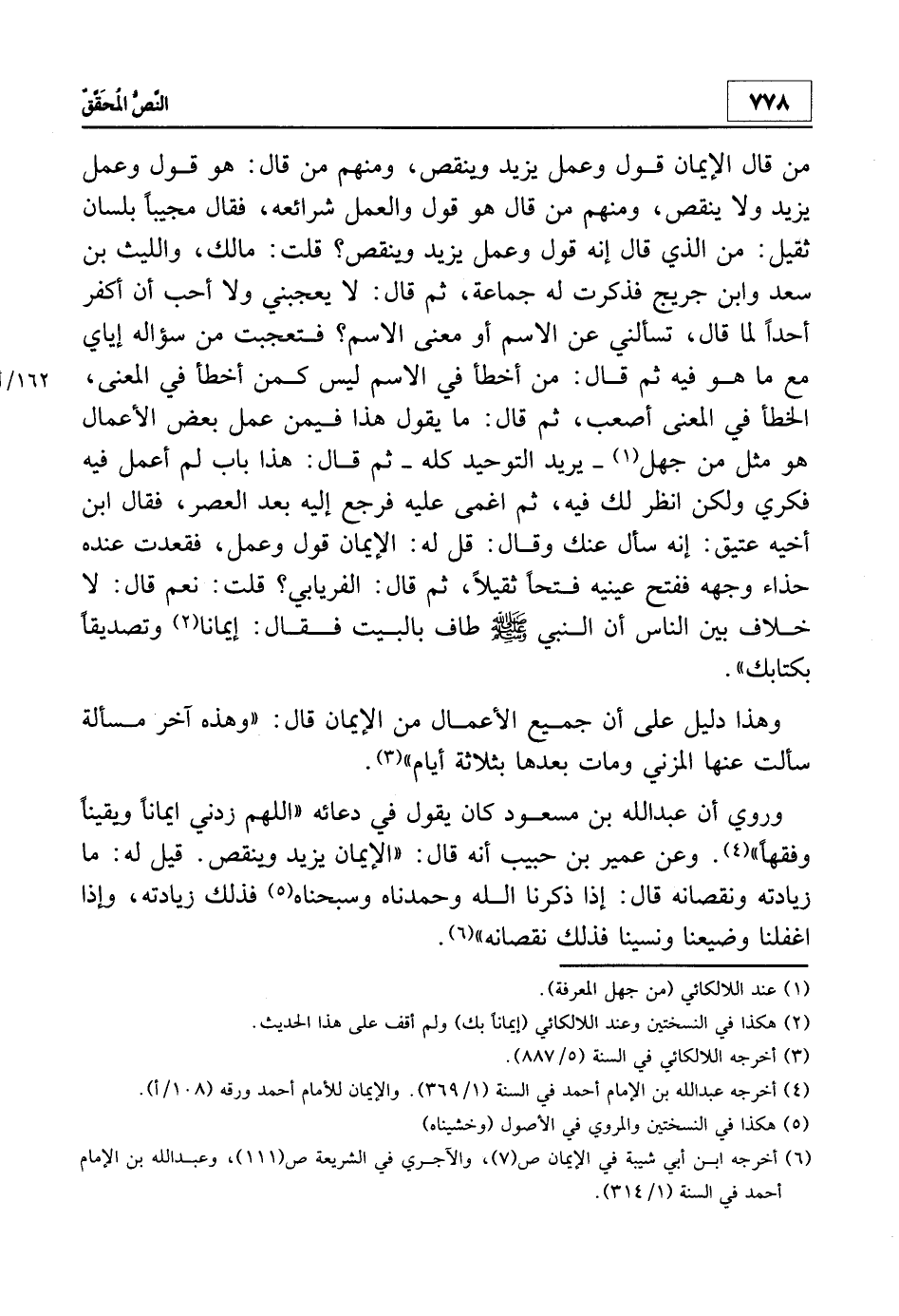 6 أخرجه ابن أبي شيبة في الإيمان ص 7، والآجري في الشريعة ص 111، وعبد الله بن الإمام أحمد في السنة 1/314.