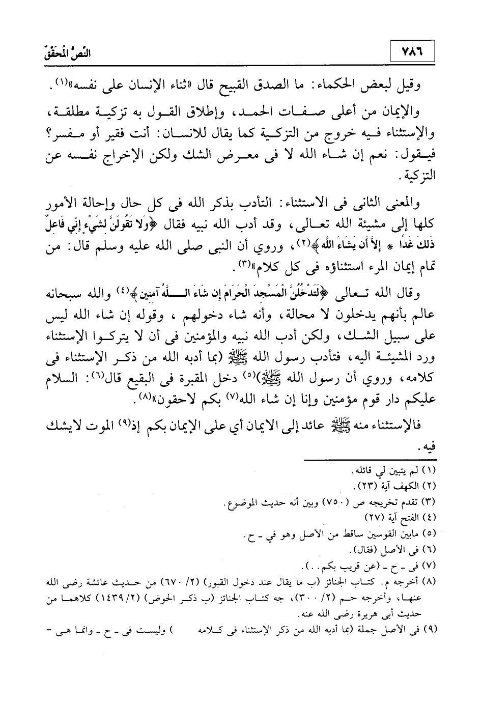 وقال الله تعالى: {لَتَدْخُلُنَّ الْمَسْجِدَ الْحَرَامَ إِنْ شَاءَ اللَّهُ آمِنِينَ} 4 والله سبحانه عالم بأنهم يدخلون لا محالة، وأنه شاء دخولهم، وقوله إن شاء الله ليس على سبيل الشك، ولكن أدب الله نبيه والمؤمن في أن لا يتركوا الاستثناء ورد المشيئة إليه، فتأدب رسول الله صلى الله عليه وسلم (بما أدبه الله من ذكر الاستثناء في كلامه، وروي أن رسول الله صلى الله عليه وسلم) 5 دخل المقبرة في البقيع قال6: "السلام عليكم دار قوم مؤمنين وإنا إن شاء الله7 بكم لاحقون" 8.فالاستثناء منه صلى الله عليه وسلم عائد إلى الإيمان أي على الإيمان بكم إذ9 الموت لا يشك فيه.