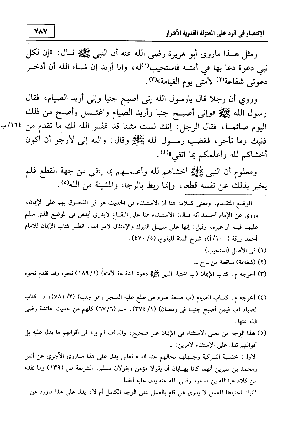 ثانياً: احتياطا للعمل لا يدري هل قام بالعمل على الوجه الكامل أم لا، يدل على هذا ما ورد عن الإمام أحمد أنه قال: أذهب إلى حديث ابن مسعود في الاستثناء في الإيمان قول والعمل الفعل فقال جئنا بالقول ونخشى أن نكون قد فرطنا في العمل. الإيمان للإمام أحمد ورقة 100/أويدل على أن السلف لم يكونوا يقصدون المعنى الذي ذكر المصنف ان كثيرا منهم عاب من لم يستثن، بل وصف تاركه بالإرجاء فقد روي الآجري بسنده عن عبد الرحمن بن مهدي أنه قال: "إذا ترك الاستثناء فهو أصل الإرجاء". الشريعة ص 139. أما الأدلة التي ذكر المصنف فقد ذكرها السلف أيضا في استدلالاتهم على الاستثناء، ومرادهم بإيرادها هو إثبات أن الاستثناء ليس على الشك في هذه المواضع المستدل بها، والله أعلم، وانظر: كلام أبي عبيد في الإيمان ص 68 - 68، والآجري في الشريعة ص 136.