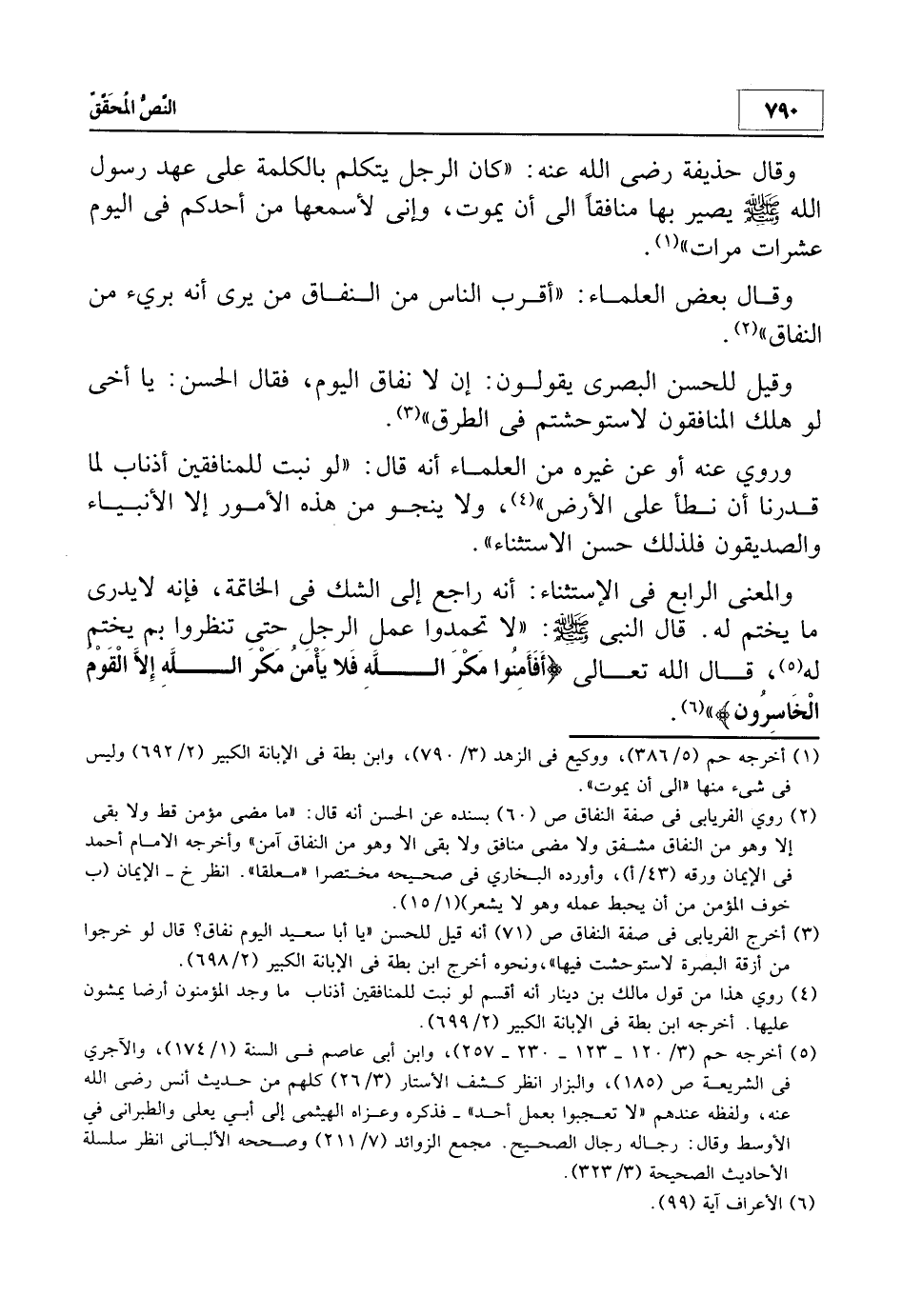 3 أخرج الفريابي في صفة النفاق ص 71 أنه قيل للحسن" يا سعيد اليوم نفاق؟ قال لو خرجوا من أزقة البصرة لاستوحشت فيها"، ونحوه أخرج ابن بطة في الإبانة الكبير 2/698.
