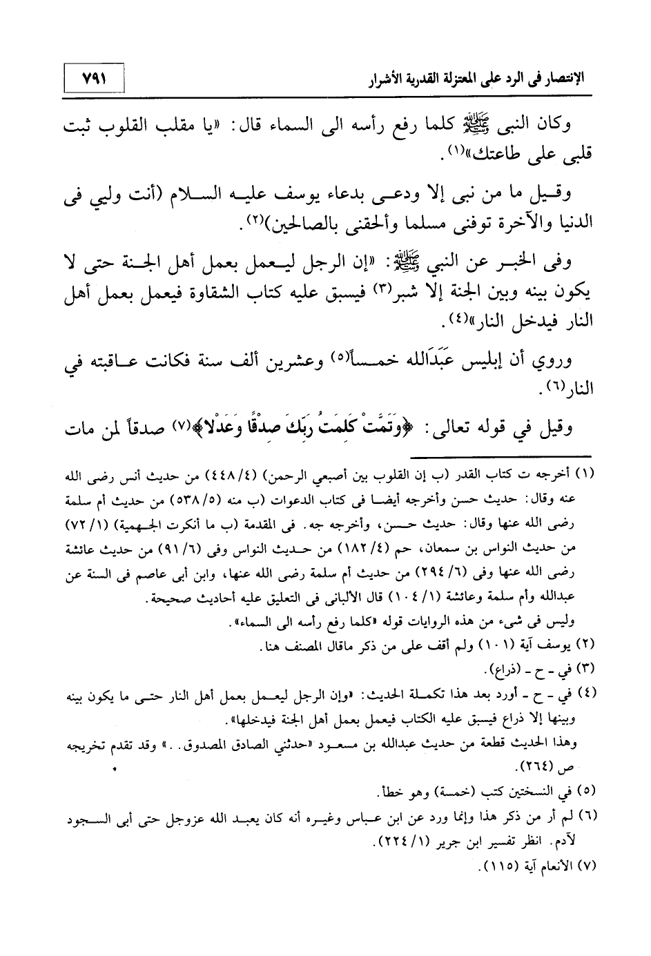 1 أخرجه ت. كتاب القدر (ب إن القلوب بين أصبعي الرحمن) 4/448 من حديث أنس - رضي الله عنه - وقال: "حديث حسن" وأخرجه أيضا في كتاب الدعوات (ب منه 5/538) من حديث أم سلمة - رضي الله عنها - وقال: "حديث حسن"، وأخرجه جه. في المقدمة (ب ما أنكرت الجهمية) 1/72 من حديث النواس بن سمعان، حم 4/182 من حديث النواس وفي 6/91 من حديث عائشة - رضي الله عنها - وفي 6/294 من حديث أم سلمة - رضي الله عنها -، وابن أبي عاصم في السنة عن عبد الله وأم سلمة وعائشة 1/104 قال الألباني في التعليق عليه: "أحاديث صحيحة, وليس في شيء من هذه الروايات قوله "كلما رفع رأسه إلى السماء".