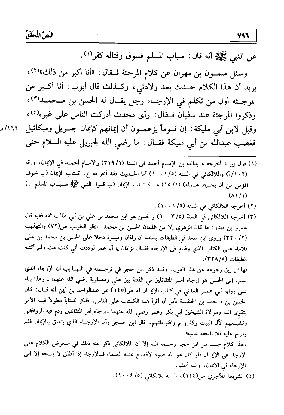 3 أخرجه اللالكائي في السنة 5/1003 والحسن هو ابن محمد بن علي بن أبي طالب ثقة فقيه قال عمرو بن دينار: "ما كان الزهري إلا من غلمان الحسن بن محمد". انظر: التقريب ص 72 والتهذيب 2/320 وورى ابن سعد في الطبقات بسنده أن زاذان وميسرة دخلا على الحسن بن محمد بن علي فلاماه على الكتاب الذي وضع في الإرجاء فقال لزاذان يا أبا عمر لوددت أني كنت مت ولم أكتبه الطبقات 5/328.