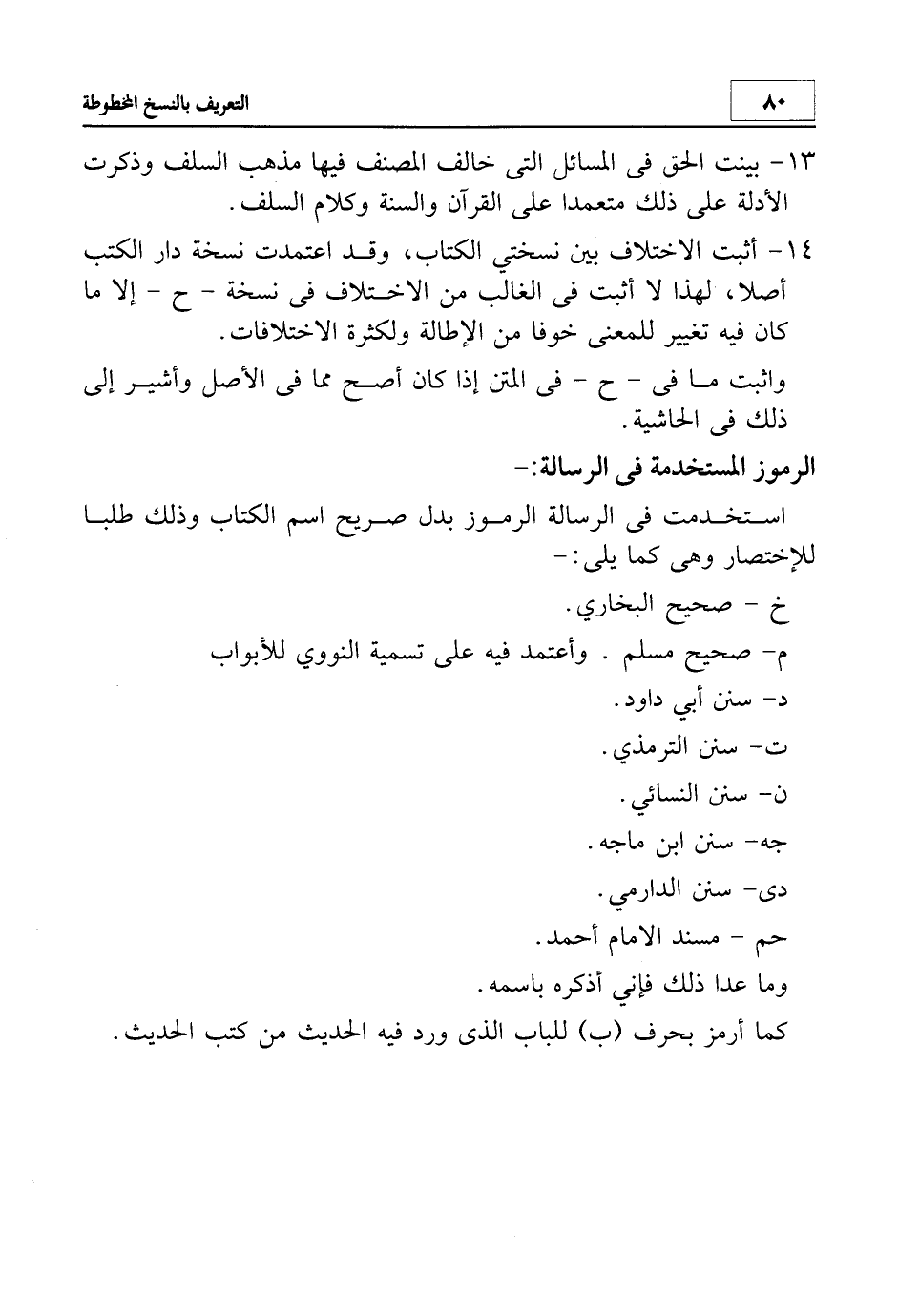 14- أثبت الاختلاف بين نسختي الكتاب، وقد اعتمدت نسخة دار الكتب أصلا، لهذا لا أثبت في الغالب من الاختلاف في نسخة -ح- إلا ما كان فيه تغيير للمعنى خوفا من الإطالة ولكثرة الاختلافات.