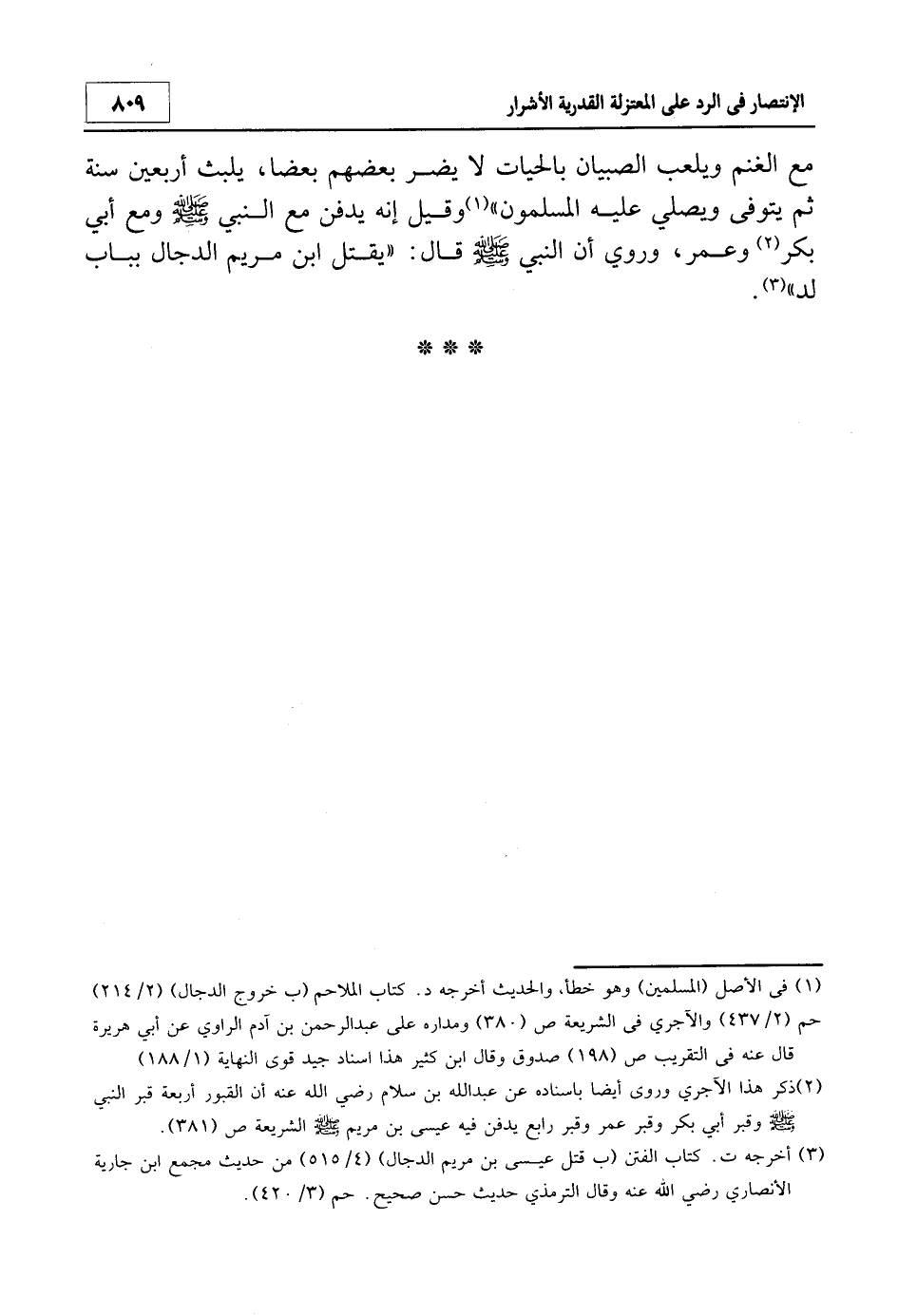 1 في الأصل (المسلمين) وهو خطأ، والحديث أخرجه د. كتاب الملاحم (ب خروج الدجال) 2/214 حم 2/437 والآجري في الشريعة ص 380 ومداره على عبد الرحمن بن آدم الراوي عن أبي هريرة قال عنه في التقريب ص 198 صدوق وقال ابن كثير هذا إسناد جيد قوي النهاية 1/188.