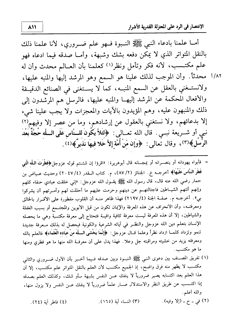 أما علمنا بادعاء النبي صلى الله عليه وسلم النبوة فهو علم ضروري، لأنا علمنا ذلك بالنقل المتواتر الذي لا يمكن دفعه بشك وشبهة، وأما صدقه فيما ادعاه فهو علم مكتسب، لأنه فكر وتأمل ونظر1 كعلمنا بأن العالم محدث وأن له محدثاً. وأن الموجب لذلك علينا هو السمع وهو المرشد إليها والمنبه عليها، ولا نستغني بالعقل عن السمع المنبه، كما لا يستغني في الصنائع الدقيقة واالأفعال المحكمة عن المرشد إليها والمنبه عليها، فالرسل هم المرشدون إلى ذلك والمنبهون عليه، وهم المؤيدون بالآيات والمعجزات ولا يجب علينا شيء إلا بدعائهم، ولا نستغني بالعقول عن إرشادهم، وما من عصر إلا وفيهم2 نبي أو شريعة نبي. قال الله تعالى: {لِئَلاّ يَكُونَ لِلنَّاسِ عَلَى اللَّهِ حُجَّةٌ بَعْدَ الرُّسُلِ} 3، وقال تعالى: {وَإِنْ مِنْ أُمَّةٍ إِلاّ خَلا فِيهَا نَذِيرٌ} 4.