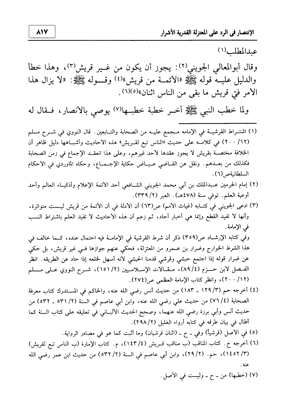 3 ادعى الجويني في كتابه (غياث الأمم) ص 63 أن الأدلة في أن الأئمة من قريش ليست متواترة، وأنها لا تفيد القطع وإنما هي أخبار آحاد، ثم زعم أن هذه الأحاديث لا تفيد العلم باشتراط النسب في الإمامة وفي كتابه الإرشاد ص 359 ذكر أن شرط القريشية في الإمامة فيه احتمال عنده، كما خالف في هذا الشرط الخوارج وضرار بن عمرو من المعتزلة، فحكي عنهم جوازها في غير قريش، بل حكي عن ضرار قوله إذا اجتمع حبشي وقرشي قدمنا الحبشي لأنه أسهل لخلعه إذا حاد عن الطريقة. انظر: الفصل لابن حزم 4/89، مقالات الإسلاميين 2/151، شرح النووي على مسلم 12/200. وانظر: كتاب الإمامة العظمى ص 274.