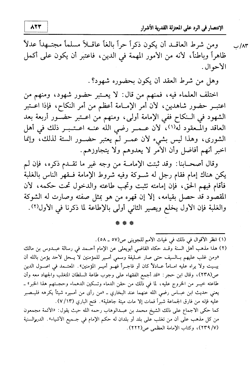 2 هذا مذهب أهل السنة وقد حكاه القاضي أبو يعلى عن الإمام أحمد في رسالة عبدوس بن مالك "ومن غلب عليهم بالسيف حتى صار خليفة وسمي أمير المؤمنين لا يحل لأحد يؤمن بالله أن يبيت ولا يراه عليه إماماً عادلاً كان أو فاجراً فهو أمير المؤمنين". المعتمدا في أصول الدين ص 238، وقال ابن حجر: "قد أجمع الفقهاء على وجوب طاعة السلطان المتغلب والجهاد معه وأن طاعته خير من الخروج عليه، لما في ذلك من حقن الدماء وتسكين الدهماء وحجتهم هذا الخبر". يعني حديث ابن عباس - رضي الله عنهما - عند البخاري - "من رأى من أميره شيئاً يكرهه فليصبر عليه فإنه من فارق الجماعة شبراً فمات إلا مات ميتة جاهلية" فتح الباري 13/7. كما حكى الإجماع على ذلك الشيخ محمد بن عبد الوهاب - رحمه الله - حيث يقول: "الأئمة مجمعون من كل مذهب على أن من تغلب على بلد أو بلدان له حكم الإمام في جميع الأشياء". الدر السنية 7/239، وكتاب الإمامة العظمى ص 222.