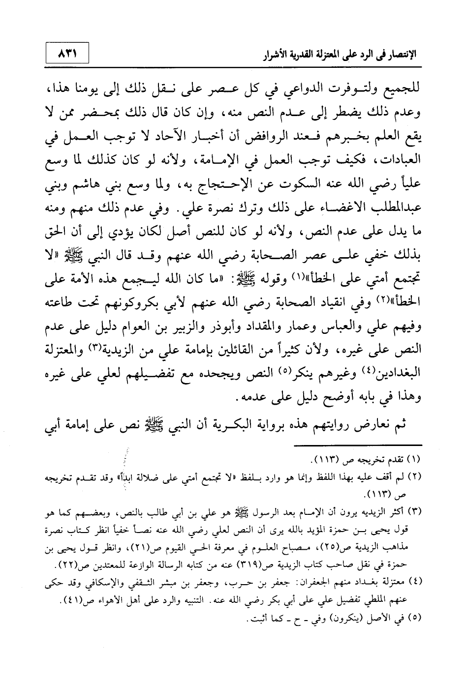 للجميع ولتوفرت الدواعي في كل عصر على نقل ذلك إلى يومنا هذا، وعدم ذلك يضطر إلى عدم النص منه، وإن كان قال ذلك بمحضر ممن لا يقع العلم بخبرهم فعند الروافض أن أخبار الآحاد لا توجب العمل في العبادات، فكيف توجب العمل في الإمامة، ولأنه لو كان كذلك لما وسع علياً - رضي الله عنه - عنه السكوت عن الاحتجاج به، ولما وسع بني هاشم وبني عبد المطلب الإغضاء على ذلك وترك نصرة علي، وفي عدم ذلك منهم ومنه ما يدل على عدم النص، ولأنه لو كان للنص أصل لكان يؤدي إلى أن الحق بذلك خفي على عصر الصحابة - رضي الله عنهم - وقد قال النبي صلى الله عليه وسلم: "لا تجمتع أمتي على الخطأ"1، وقوله صلى الله عليه وسلم: "ما كان الله ليجمع هذه الأمة على الخطأ"2 وفي انقياد الصحابة - رضي الله عنهم - لأبي بكر وكونهم تحت طاعته وفيهم علي والعباس وعمار والمقداد وأبو ذر والزبير بن العوام دليل على عدم النص على غيره، ولأن كثيراً من القائلين بإمامة علي من الزيدية3 والمعتزلة البغدادين4 وغيرهم ينكر5 النص ويجحده مع تفضيلهم لعلي على غيره وهذا في بابه أوضح دليل على عدمه. ثم نعارض روايتهم هذه برواية البكرية أن النبي صلى الله عليه وسلم نص على إمامة أبي