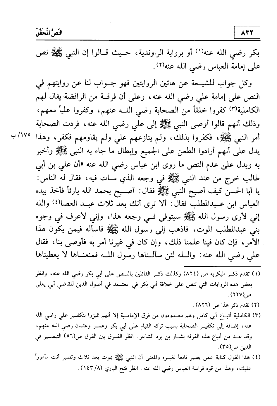 بكر - رضي الله عنه1 - أو برواية الراوندية، حيث قالوا إن النبي صلى الله عليه وسلم نص على إمامة العباس - رضي الله عنه - 2.