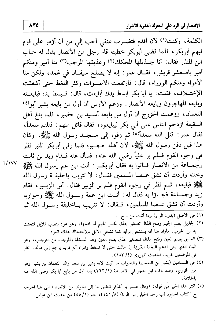 5 أكثر هذا الخبر من قوله: "وقال عمر يا أبا بكر انطلق بنا إلى إخواننا من الأنصار" إلى هنا أخرجه خ. كتاب الحدود (ب رجم الحبلى من الزنا) 8/141، حم 1/55 من حديث ابن عباس.
