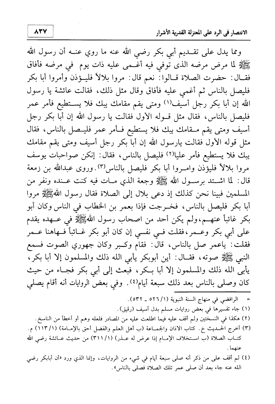 3 أخرج الحديث خ. كتاب الآذان والجماعة (ب أهل العلم والفضل أحق بالإمامة) 1/113م. كتاب الصلاة (ب استخلاف الإمام إذا عرض له عذر) 1/311 من حديث عائشة - رضي الله عنهما -.