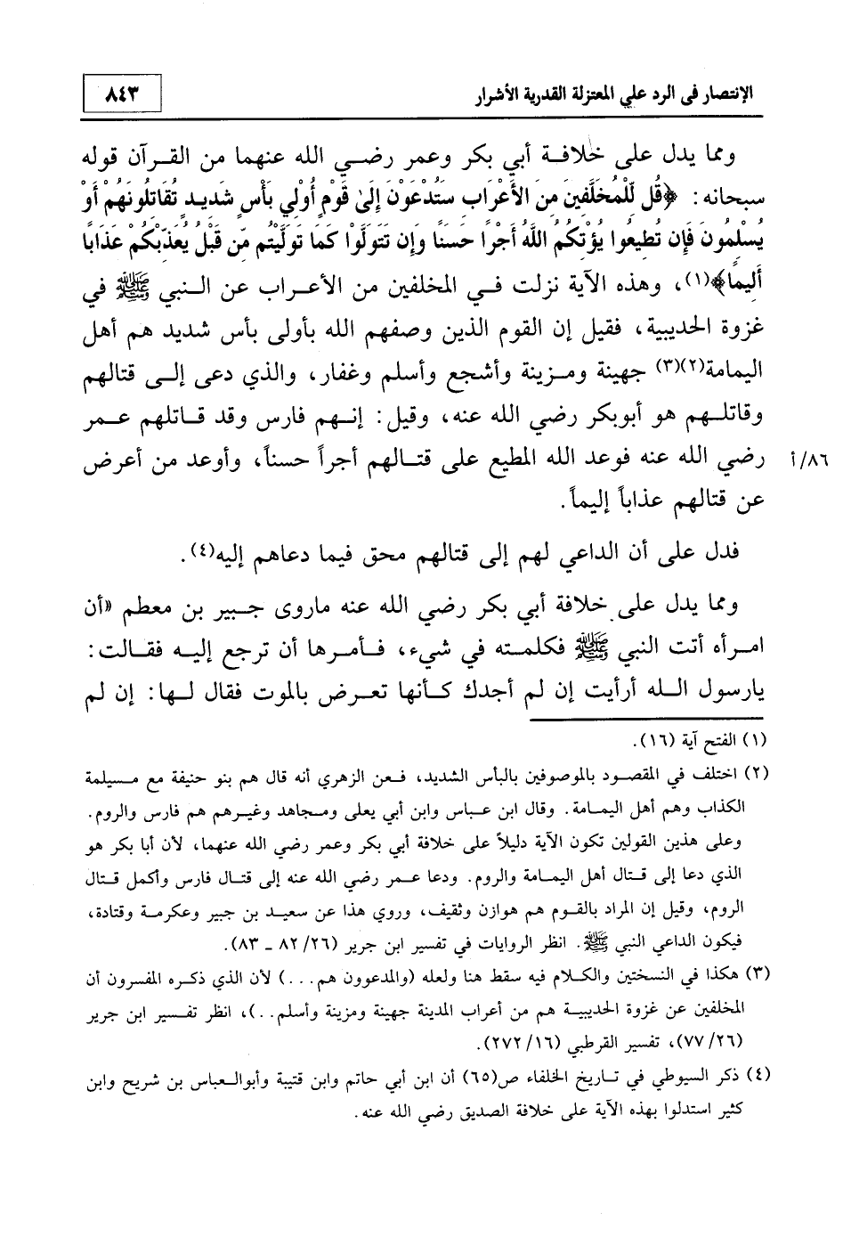 ومما يدل على خلافه أبي بكر وعمر - رضي الله عنهما - من القرآن قوله سبحانه: {قُلْ لِلْمُخَلَّفِينَ مِنَ الأعْرَابِ سَتُدْعَوْنَ إِلَى قَوْمٍ أُولِي بَأْسٍ شَدِيدٍ تُقَاتِلُونَهُمْ أَوْ يُسْلِمُونَ فَإِنْ تُطِيعُوا يُؤْتِكُمُ اللَّهُ أَجْراً حَسَناً وَإِنْ تَتَوَلَّوْا كَمَا تَوَلَّيْتُمْ مِنْ قَبْلُ يُعَذِّبْكُمْ عَذَاباً أَلِيماً} 1، وهذه الآية نزلت في المخلفين من الأعراب عن النبي صلى الله عليه وسلم في غزوة الحديبية، فقيل إن القوم الذين وصفهم الله بأولى بأس شديد هم أهل اليمامة2، 3 جهينة ومزينة وأشجع وأسلم وغفار والذي دعى إلى قتالهم وقاتلهم هو أبو بكر - رضي الله عنه -، وقيل: إنهم فارس وقد قاتلهم عمر - رضي الله عنه - فوعد الله المطيع على قتالهم أجراً حسناً، وأوعد من أعرض عن قتالهم عذاباً أليماً. فدل على أن الداعي لهم إلى قتالهم محق فيما دعاهم إليه4.