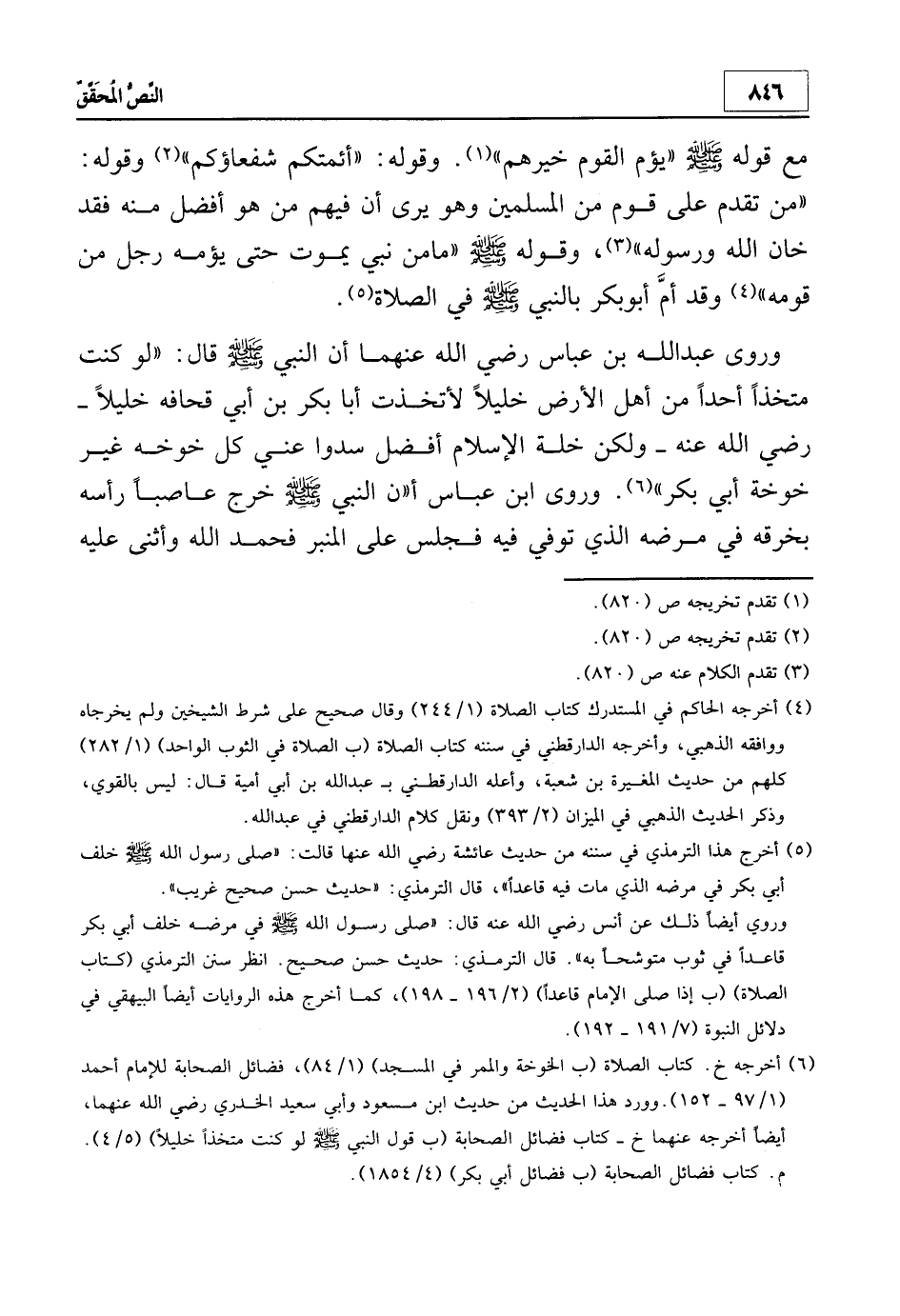 6 أخرجه خ. كتاب الصلاة (ب الخوجة والممر في المسجد) 1/84، فضائل الصحابة للإمام أحمد 1/97 - 152. وورد هذا الحديث من حديث ابن مسعود وأبي سعيد الخدري - رضي الله عنهما -، ايضاً أخرجه عنهما خ - كتاب فضائل الصحابة (ب قول النبي صلى الله عليه وسلم لو كنت متخذاً خليلاً) 5/4. م. كتاب فضائل الصحابة (ب فضائل أبي بكر) 4/1854.