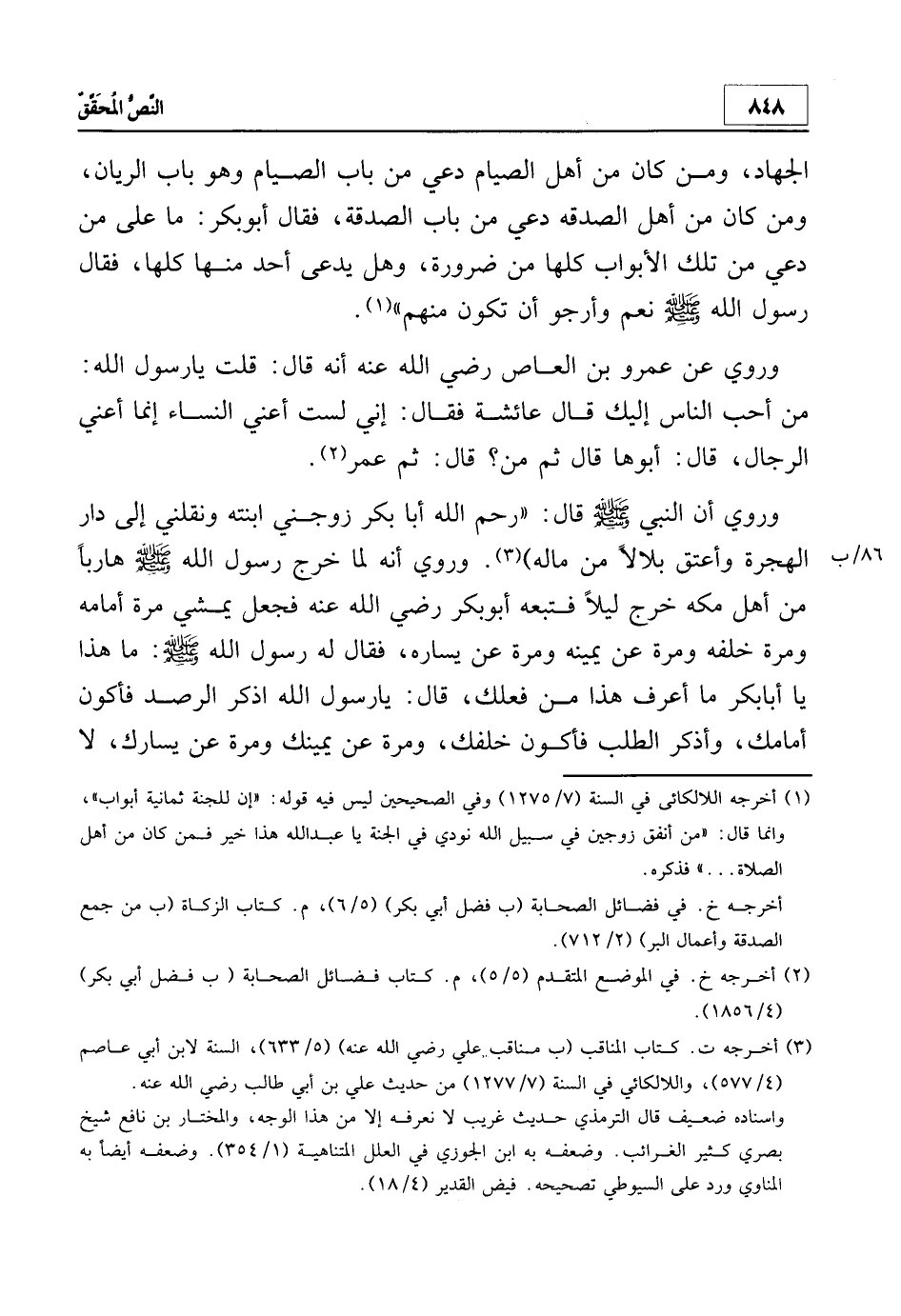 1 أخرجه اللالكائي في السنة 7/1275 وفي الصحيحين ليس فيه قوله: "إن للجنة ثمانية أبواب"، وإنما قال: "من أنفق زوجين في سبيل الله نودي في الجنة يا عبد الله هذا خير فمن كان من أهل الصلاة ... " فذكره. أخرجه خ. في فضائل الصحابة (ب فضل أبي بكر) 5/6، م. كتاب الزكاة (ب من جمع الصدقة وأعمال البر) 2/712.