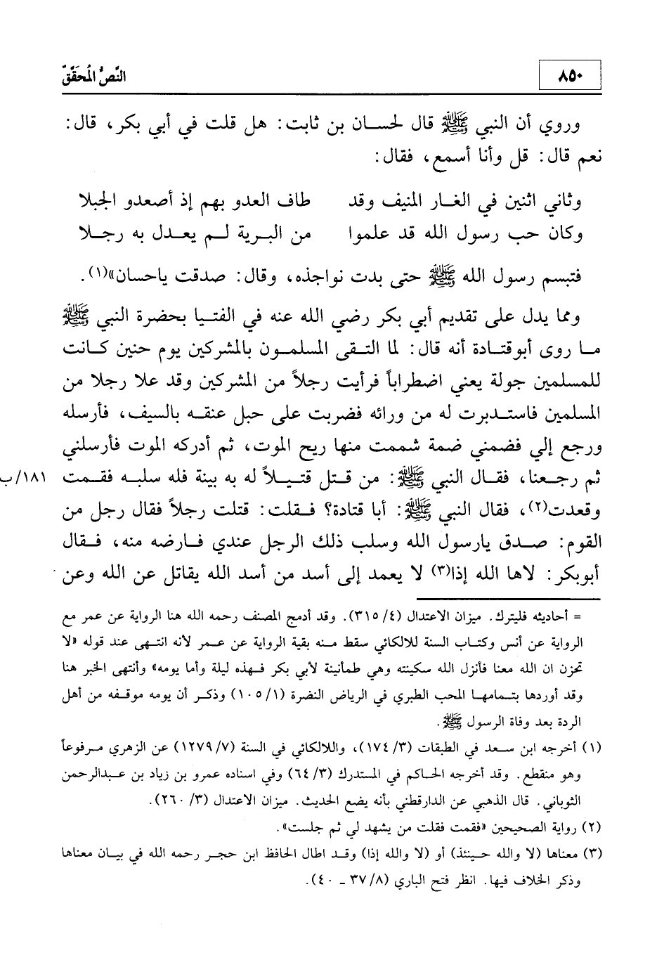 وروي أن النبي صلى الله عليه وسلم قال لحسان بن ثابت: "هل قلت في أبي بكر؟ "، قال نعم قال: "قل وأنا أسمع"، فقال: