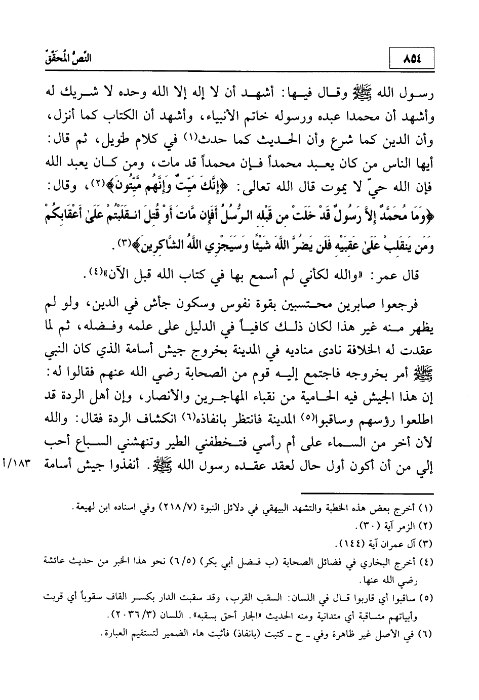 رسول الله صلى الله عليه وسلم وقال فيها: "أشهد أن لا إله إلا الله وحده لا شريك له وأشهد أن محمدا عبده ورسوله خاتم الأنبياء، وأشهد أن الكتاب كما أنزل، وأن الدين كما شرع وأن الحديث كما حدث"1 في كلام طويل، ثم قال: "أيها الناس من كان يعبد محمداً فإن محمداً قد مات، ومن كان يعبد الله فإن الله حيّ لا يموت قال الله تعالى: {إِنَّكَ مَيِّتٌ وَإِنَّهُمْ مَيِّتُونَ} 2، وقال: {وَمَا مُحَمَّدٌ إِلَّا رَسُولٌ قَدْ خَلَتْ مِنْ قَبْلِهِ الرُّسُلُ أَفَإِنْ مَاتَ أَوْ قُتِلَ انْقَلَبْتُمْ عَلَى أَعْقَابِكُمْ وَمَنْ يَنْقَلِبْ عَلَى عَقِبَيْهِ فَلَنْ يَضُرَّ اللَّهَ شَيْئاً وَسَيَجْزِي اللَّهُ الشَّاكِرِينَ} 3.
