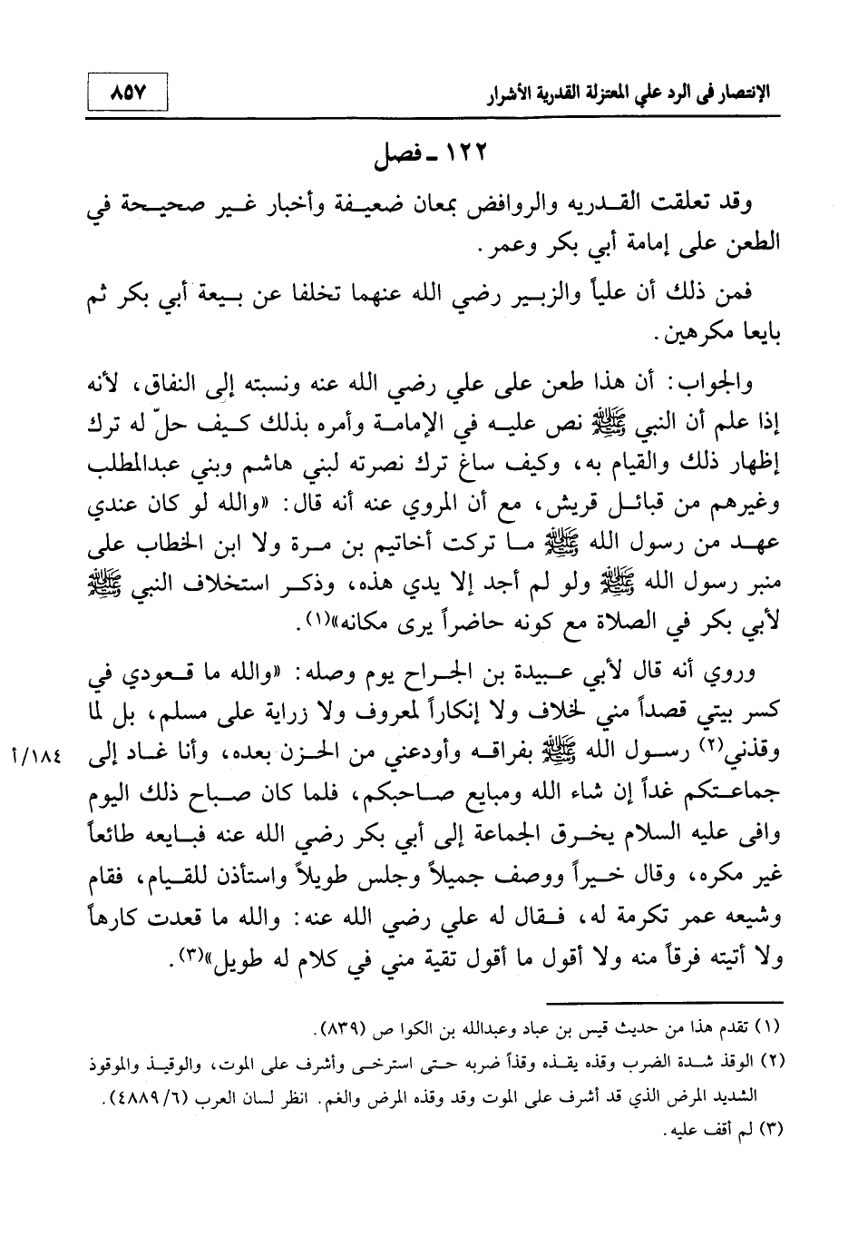 وقد تعلقت القدرية والروافض بمعان ضعيفة وأخبار غير صحيحة في الطعن على إمامة أبي بكر وعمر.