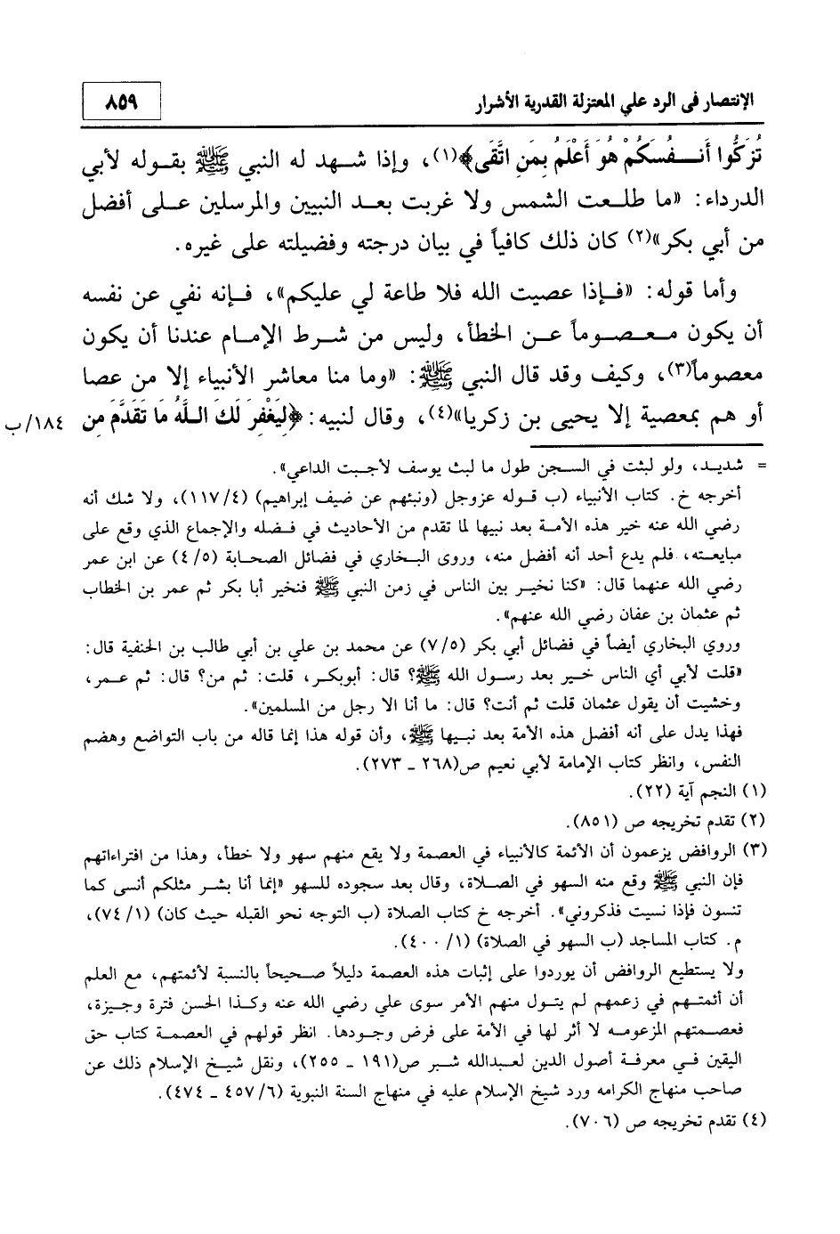 ولا يستطيع الروافض أن يوردوا على إثبات هذه العصمة دليلاً صحيحاً بالنسبة لأئمتهم، مع العلم أن أئمتهم في. عمهم لم يتول منهم الأمر سوى علي - رضي الله عنه - وكذا الحسن فترة وجيزة، فعصمتهم المزعومة لا أثر لها في الأمة على فرض وجودها. انظر: قولهم في العصمة كتاب حق اليقين في معرفة أصول الدين لعبد الله شبر ص 191 - 255، ونقل شيخ الإسلام ذلك عن صاحب منهاج الكرامة ورد شيخ الإسلام عليه في منهاج السنة النبوية 6/457 - 474.