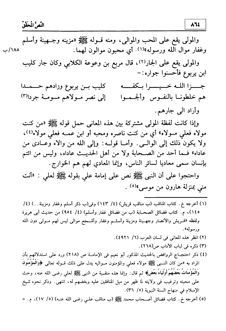 وإذا كانت لفظة المولى مشتركة بين هذه المعاني حمل قوله صلى الله عليه وسلم: "من كنت مولاه فعلي مولاه" أي من كنت ناصره ومحبه أو ابن عمه فعلي مولاه4، ولا يكون ذلك إلى الوالي. وأما قوله: "وإلى الله من والاه وعادي من عاداه" فما أحد من الصحابة ولا من أهل الحديث عاداه، وليس من ائتم بإنسان سمى معاديا لسائر الناس، وإنما المعادي لهم هم الخوارج.