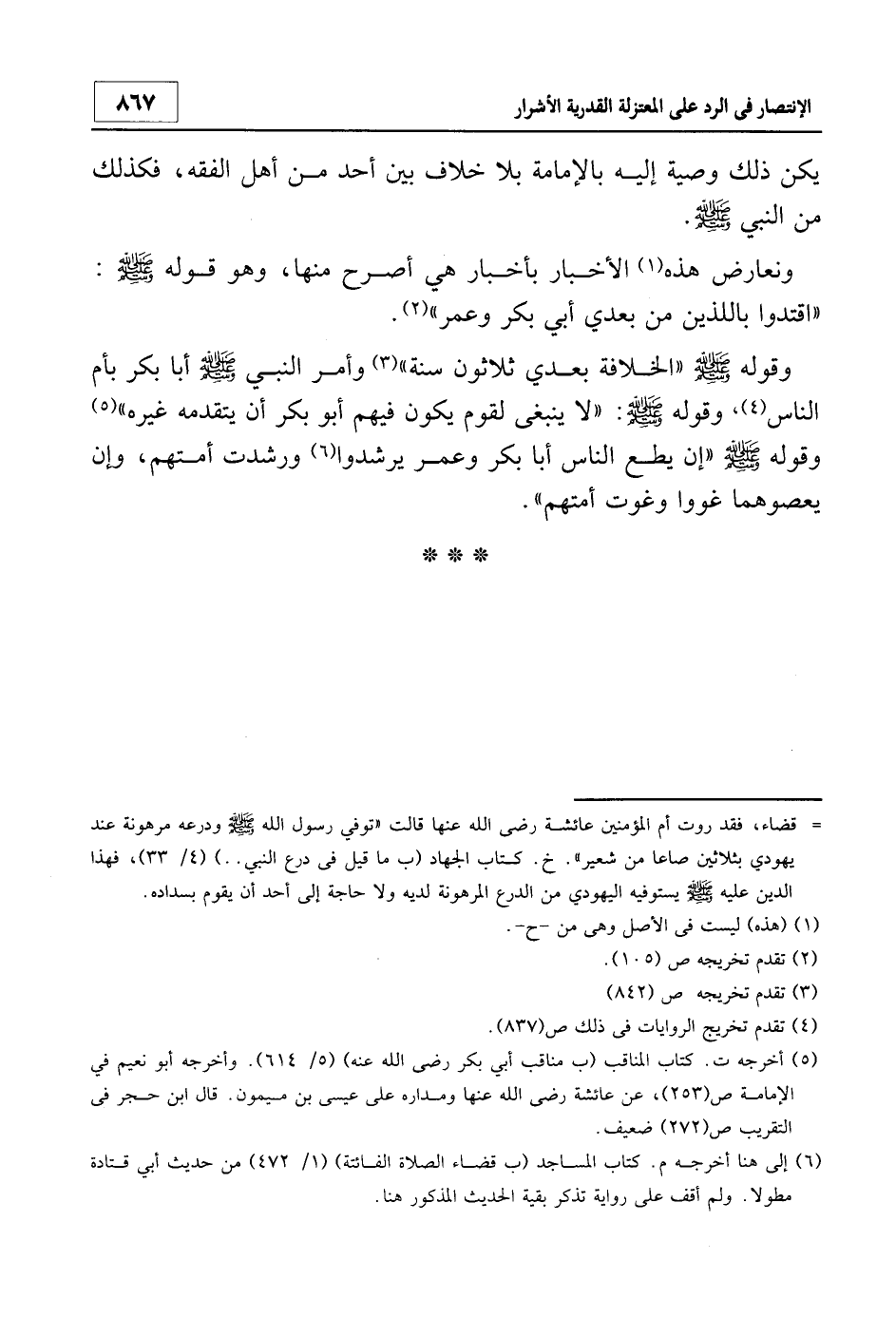 ونعارض هذه1 الأخبار بأخبار هي أصرح منها، وهو قوله صلى الله عليه وسلم: " اقتدوا باللذين من بعدي أبي بكر وعمر" 2. وقوله صلى الله عليه وسلم: "الخلافة بعدي ثلاثون سنة "3 وأمر النبي صلى الله عليه وسلم أبا بكر بأم الناس4، وقوله صلى الله عليه وسلم: "لا ينبغي لقوم يكون فيهم أبو بكر أن يتقدمه غيره "5 وقوله صلى الله عليه وسلم: "إن يطع الناس أبا بكر وعمر يرشدوا "6 ورشدت أمتهم، وإن يعصموهما غووا وغوت أمتهم".