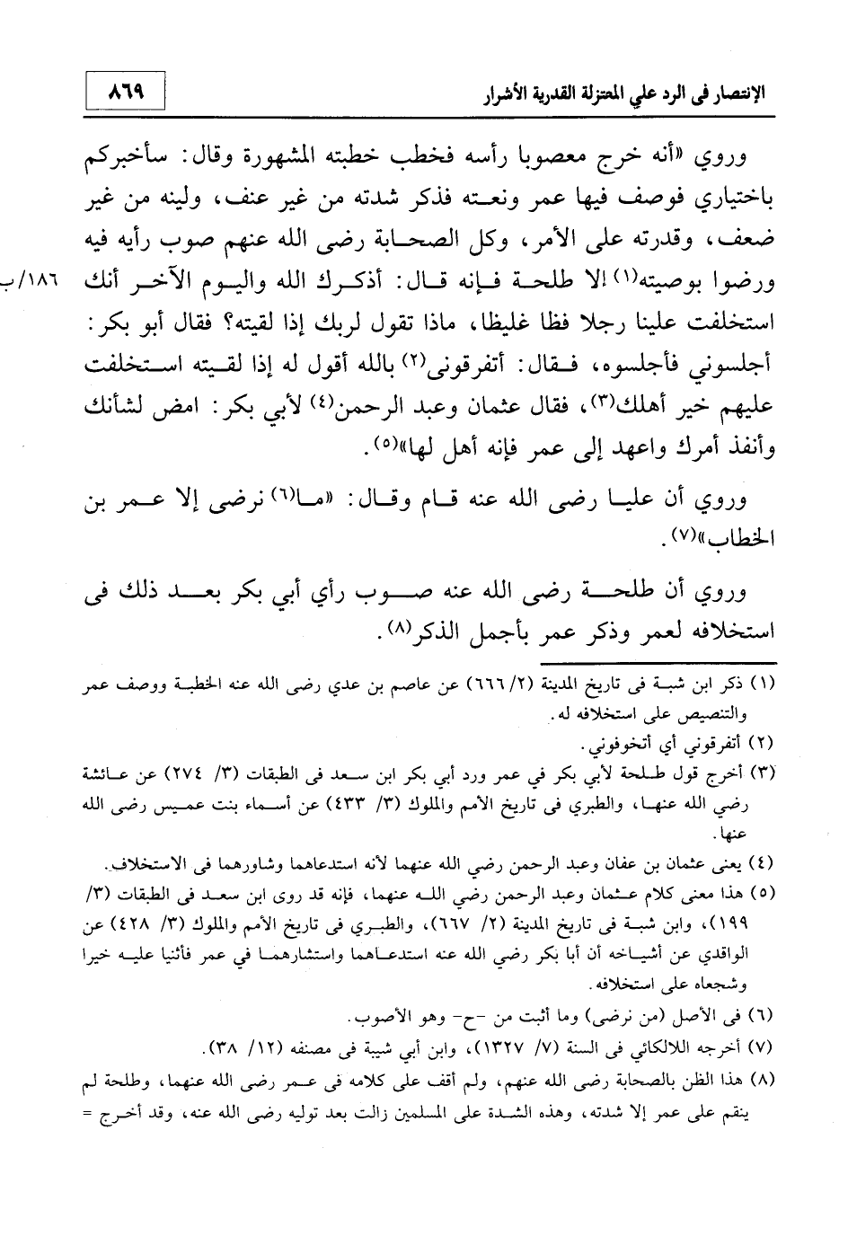 3 أخرج قول طلحة لأبي بكر في عمر ورد أبي بكر ابن سعد في الطبقات 3/274 عن عائشة - رضي الله عنها -، والطبري في تاريخ الأمم والملوك 3/433 عن أسماء بنت عميس - رضي الله عنها.