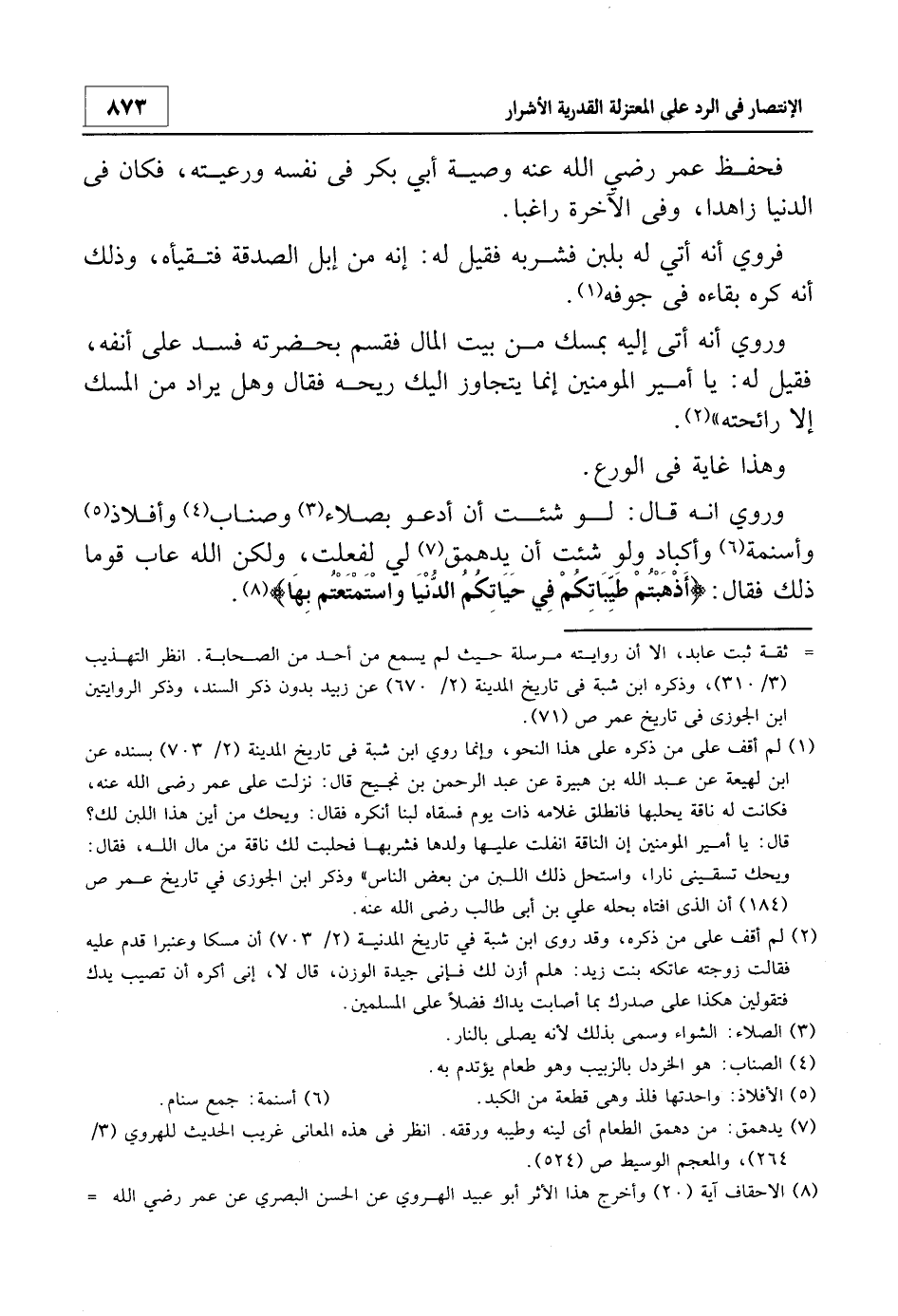8 الأحقاف آية (20) وأخرج هذا الأثر أبو عبيد الهروي عن الحسن البصري عن عمر - رضي الله عنه -، في غريب الحديث 3/263، وأخرج نحوه أيضا عن الحسن ابن سعد في الطبقات 3/279، وعمر بن شبة في تاريخ المدينة 2/696، وهو مرسل.