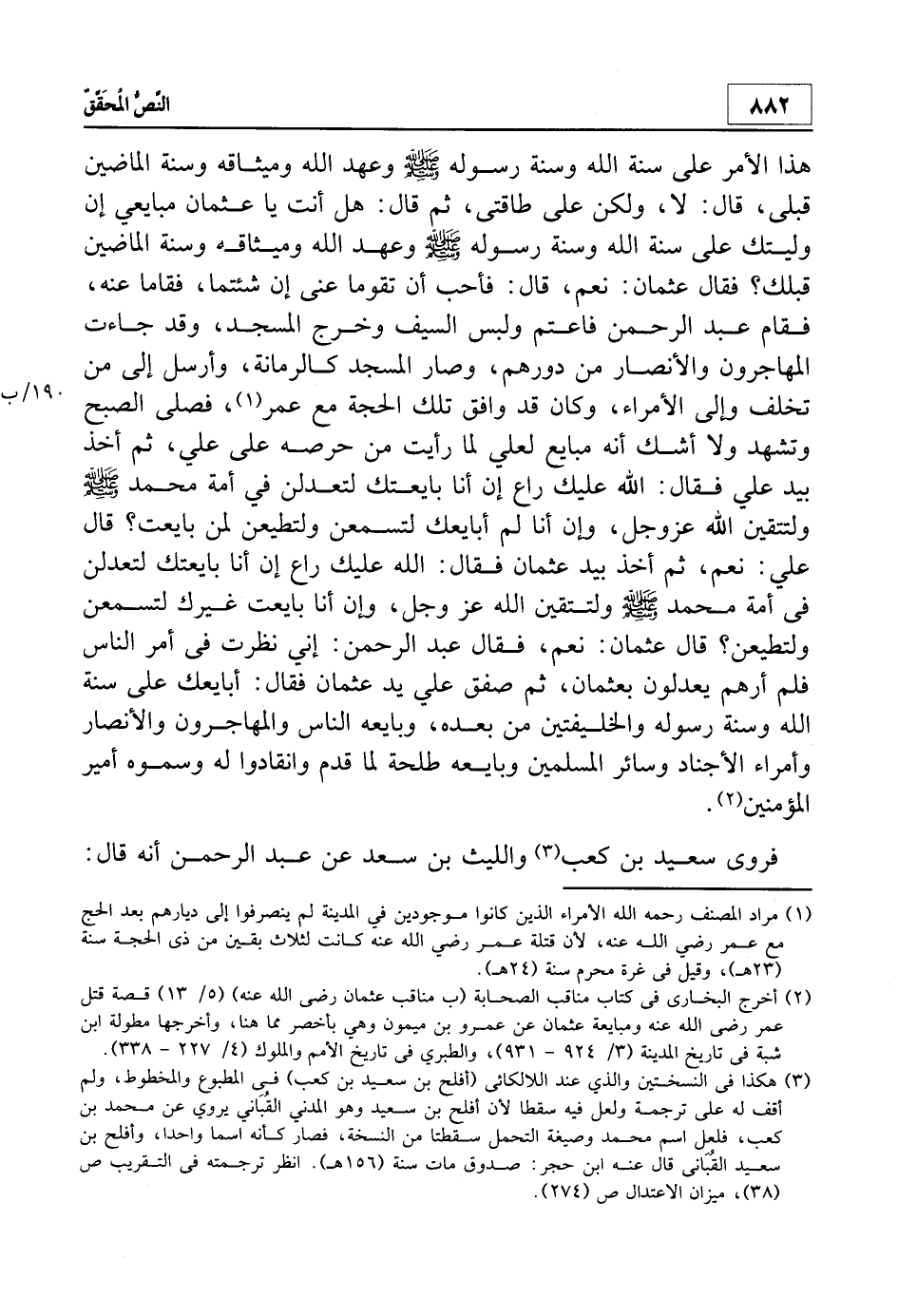 هذا الأمر على سنة الله سنة رسوله صلى الله عليه وسلم وعهد الله وميثاقه وسنة الماضين قبلي، قال: لا، ولكن على طاقتي، ثم قال: هل أنت يا عثمان مبايعي إن وليتك على سنة الله وسنة رسوله صلى الله عليه وسلم وعهد الله وميثاقه وسنة الماضين قبلك؟ فقال عثمان: نعم، قال: فأحب أن تقوما عني إن شئتما، فقاما عنه، فقام عبد الرحمن فاعتم ولبس السيف وخرج المسجد، وقد جاءت المهاجرون والأنصار من دورهم، وصار المسجد كالرمانة، وأرسل إلى من تخلف وإلى الأمراء، وكان قد وافق تلك الحجة مع عمر1، فصلى الصبح وتشهد ولا أشك أنه مبايع لعلي لما رأيت من حرصه على علي، ثم أخذ بيد علي فقال: الله عليك راع إن أنا بايعتك لتعدلن في أمة محمد صلى الله عليه وسلم ولتتقين الله عز وجل، وإن أنا لم أبايعك لتسمعن ولتطيعن لمن بايعت؟ قال علي: نعم، ثم أخذ بيد عثمان فقال: الله عليك راع إن أنا بايعتك لتعدلن في أمة محمد صلى الله عليه وسلم ولتتقين الله عز وجل، وإن أنا بايعت غيرك لتسمعن ولتطيعن؟ قال عثمان: نعم، فقال عبد الرحمن: إني نظرت في أمر الناس فلم أرهم يعدلون بعثمان، ثم صفق علي يد عثمان فقال: أبايعك على سنة الله وسنة رسوله والخليفتين من بعده، وبايعه الناس والمهاجرون والأنصار وأمراء الأجناد وسائر المسلمين وبايعه طلحة لما قدم وانقادوا له وسموه أمير المؤمنين"2.