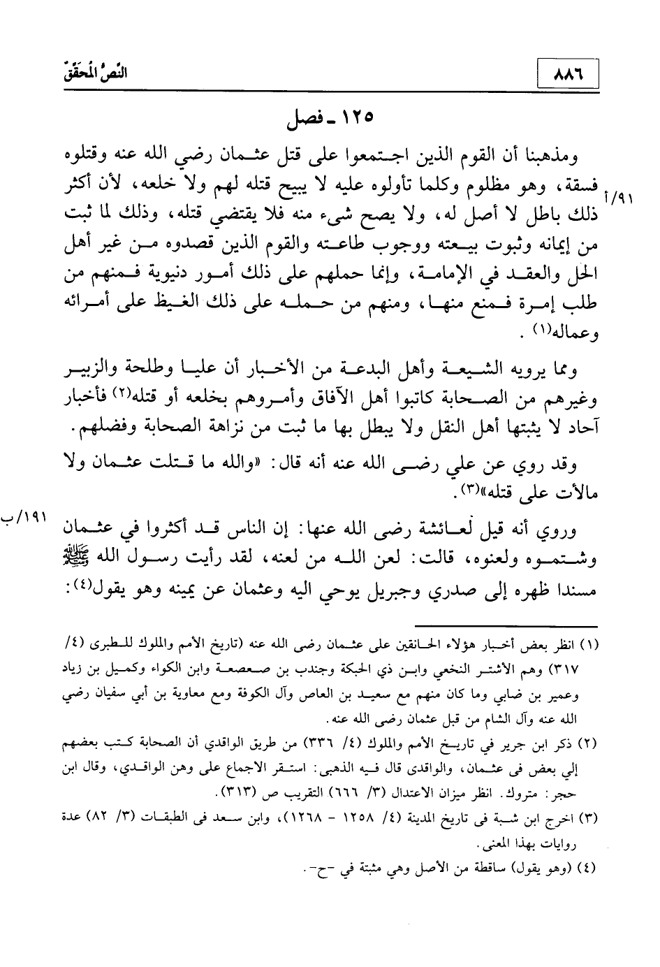 ومما يرويه الشيعة وأهل البدعة من الأخبار أن عليا وطلحة والزبير وغيرهم من الصحابة كاتبوا أهل الآفاق وأمروهم بخلعه أو قتله2 فأخبار آحاد لا يثبتها أهل النقل ولا يبطل بها ما ثبت من نزاهة الصحابة وفضلهم.
