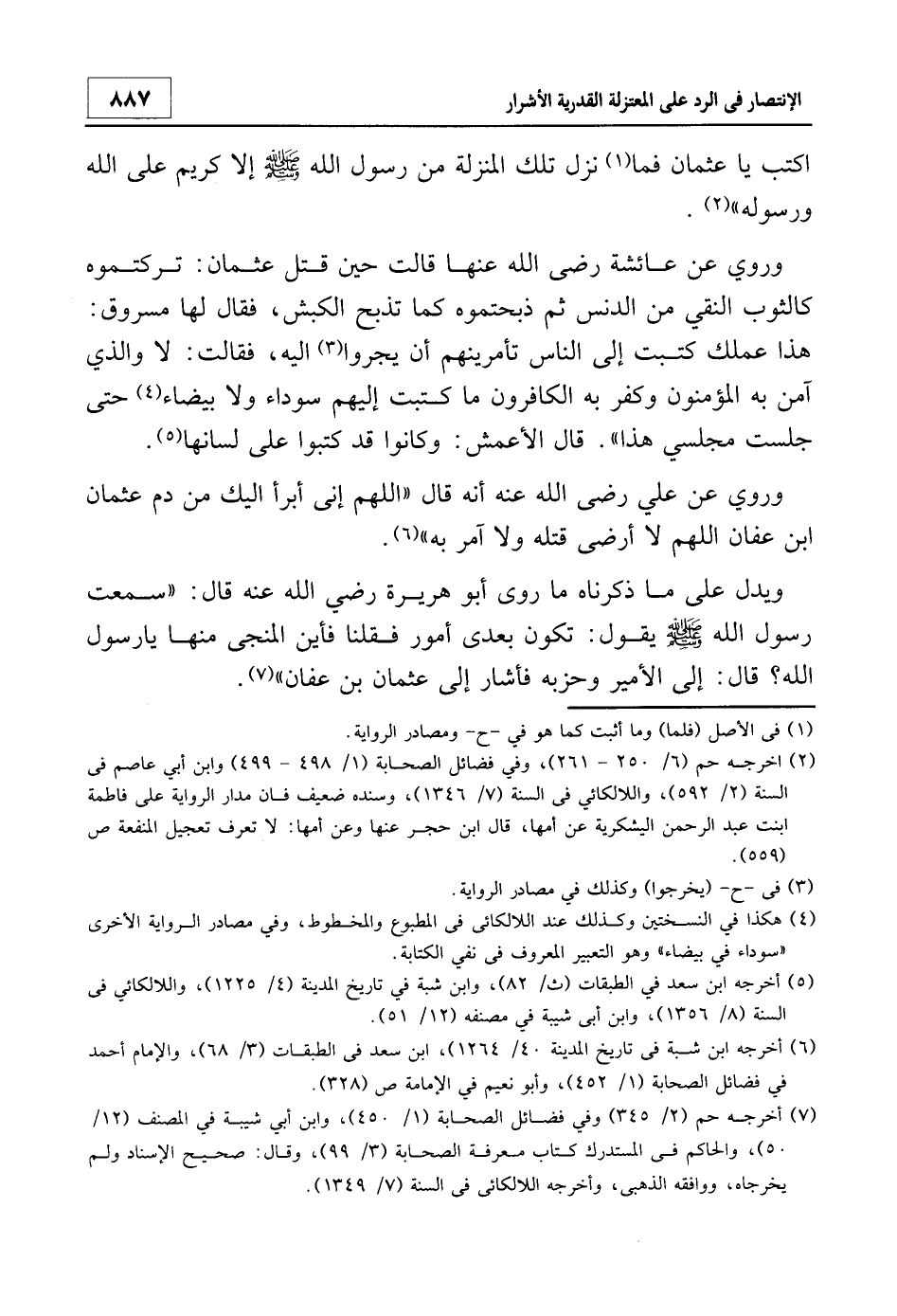 وروي عن علي - رضي الله عنه - أنه قال: "اللهم إني أبرأ إليك من دم عثمان ابن عفان اللهم لا أرضى قتله ولا آمر به"6.ويدل على ما ذكرناه ما روى أبو هريرة - رضي الله عنه - قال: "سمعت رسول الله صلى الله عليه وسلم يقول: "تكون بعدي أمور فقلنا فأين المنجى منها يا رسول الله؟ قال: إلى الأمير وحزبه فأشار إلى عثمان بن عفان"7.