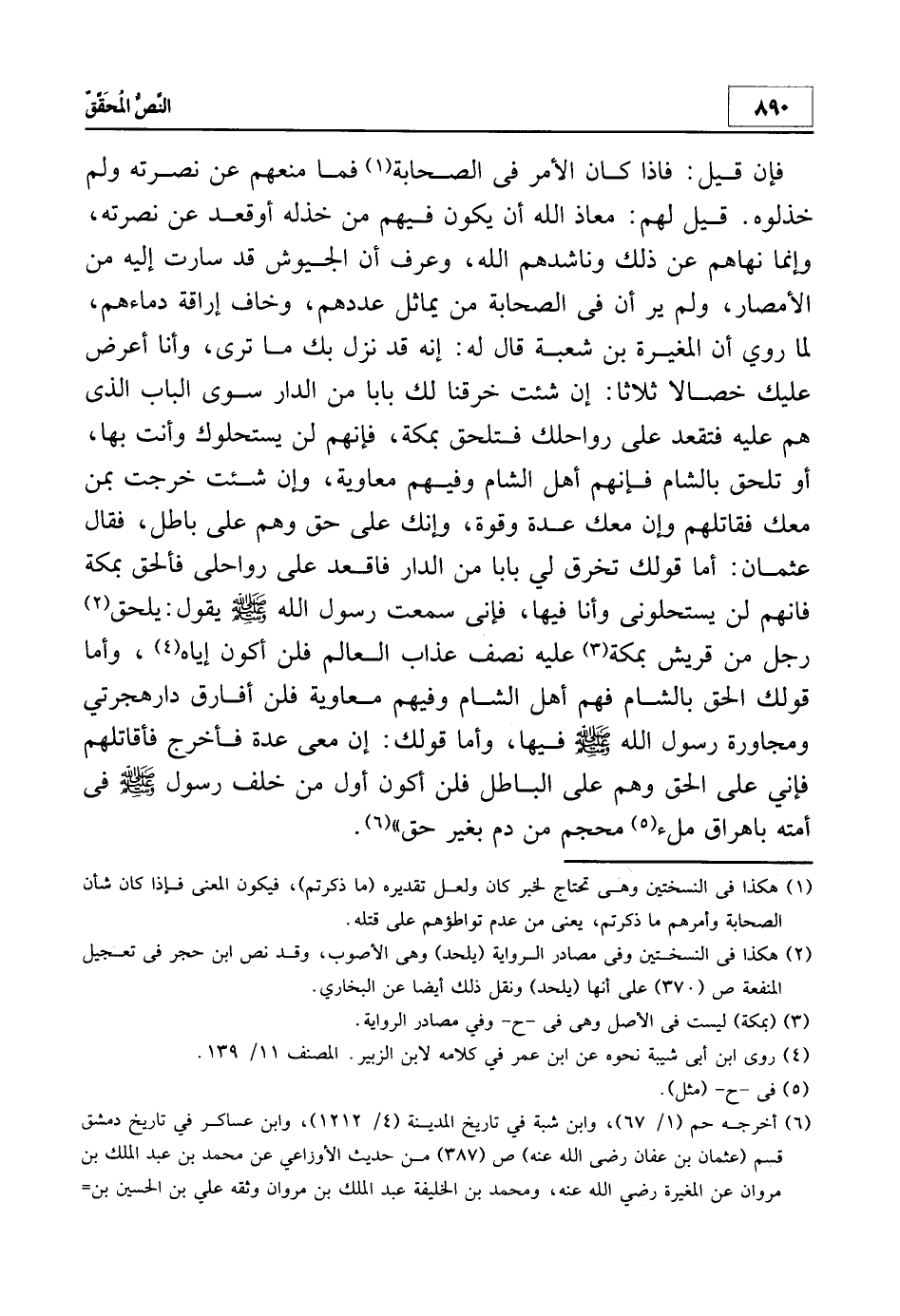 فإن قيل: فإذا كان الأمر في الصحابة1 فما منعهم عن نصرته ولم خذلوه. قيل لهم: معاذ الله أن يكون فيهم من خذله أو قعد عن نصرته، وإنما نهاهم عن ذلك وناشدهم الله، وعرف أن الجيوش قد سارت إليه من الأمصار، ولم ير أن في الصحابة من يماثل عددهم، وخاف إراقة دماءهم، لما روي أن المغيرة بن شعبة قال له: إنه قد نزل بك ما ترى، وأنا أعرض عليك خصالا ثلاثا: إن شئت خرقنا لك بابا من الدار سوى الباب الذي هم عليه فتقعد على رواحلك فتلحق بمكة، فإنهم لن يستحلوك وأنت بها، أو تلحق بالشام فإنهم أهل الشام وفيهم معاوية، وإن شئت خرجت بمن معك فقاتلهم وإن معك عدة وقوة، وإنك على حق وهم على باطل، فقال عثمان: أما قولك تخرق لي بابا من الدار فاقعد على رواحلي فألحق بمكة فإنهم لن يستحلوني وأنا فيها، فإني سمعت رسول الله صلى الله عليه وسلم يقول: يلحق2 رجل من قريش بمكة3عليه نصف عذاب العالم فلن أكون إياه4، وأما قولك الحق بالشام فهم أهل الشام وفيهم معاوية فلن أفارق دار هجرتي ومجاورة رسول الله صلى الله عليه وسلم فيها، وأما قولك: إن معي عدة فأخرج فأقاتلهم فإني على الحق وهم على الباطل فلن أكون أول من خلف رسول الله صلى الله عليه وسلم في أمته بإهراق ملء5 محجم من دم بغير حق"6.