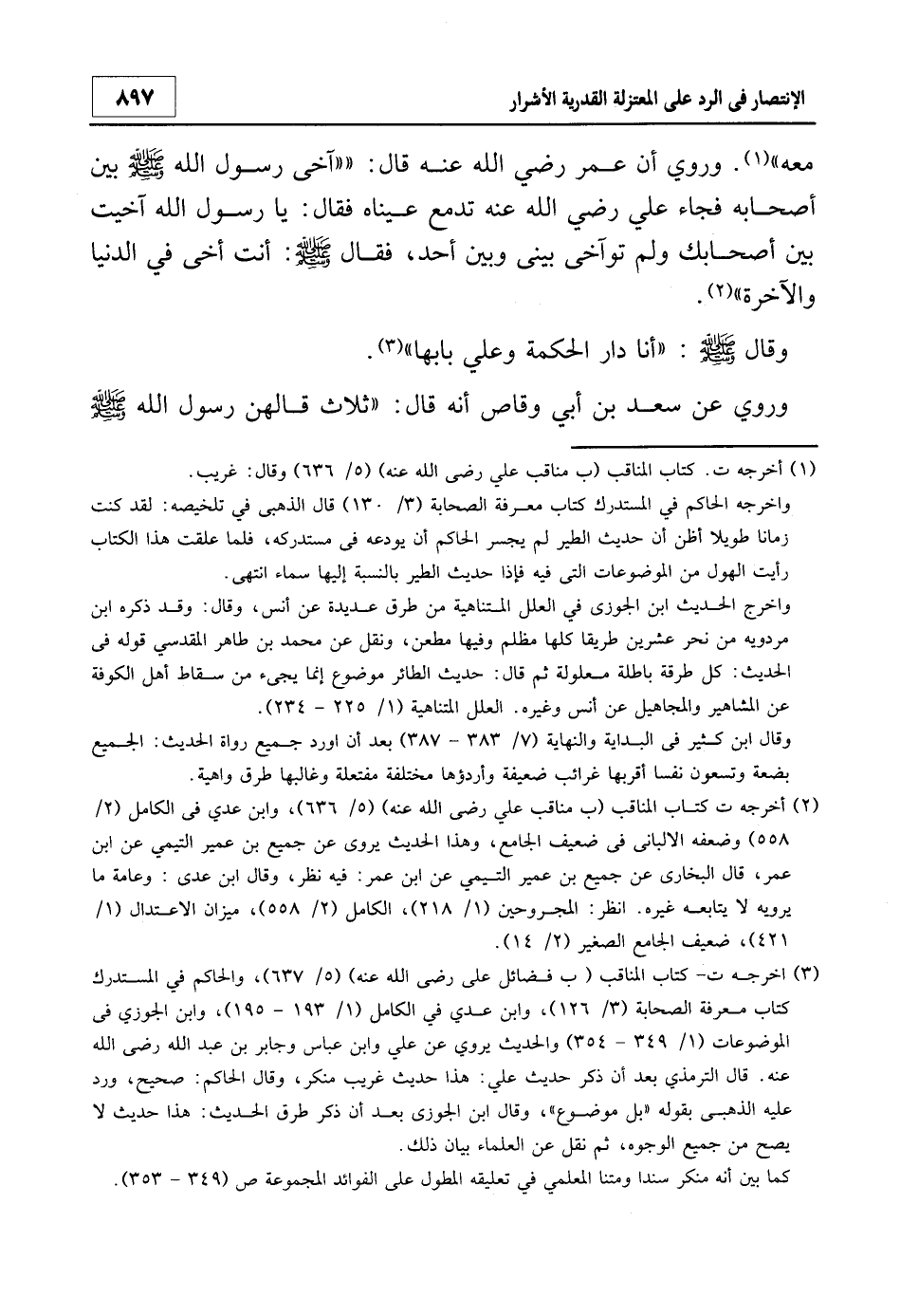 3أخرجه ت. كتاب المناقب (ب فضائل علي - رضي الله عنه -) 5/637، والحاكم في المستدرك كتاب معرفة الصحابة 3/126، وابن عدي في الكامل 1/193 - 195، وابن الجوزي في الموضوعات 1/349 – 354: "والحديث يروي عن علي وابن عباس وجابر بن عبد الله - رضي الله عنهم –". قال الترمذي بعد أن ذكر حديث علي: "هذا حديث غريب منكر"، وقال الحاكم: صحيح"، ورد عليه الذهبي بقوله: "بل موضوع"، وقال ابن الجوزي بعد أن ذكر طرق الحديث: "هذا حديث لا يصح من جميع الوجوه"، ثم نقل عن العلماء بيان ذلك. كما بين أنه منكر سندا ومتنا المعلمي في تعليقه المطول على الفوائد المجموعة ص 349 - 353.