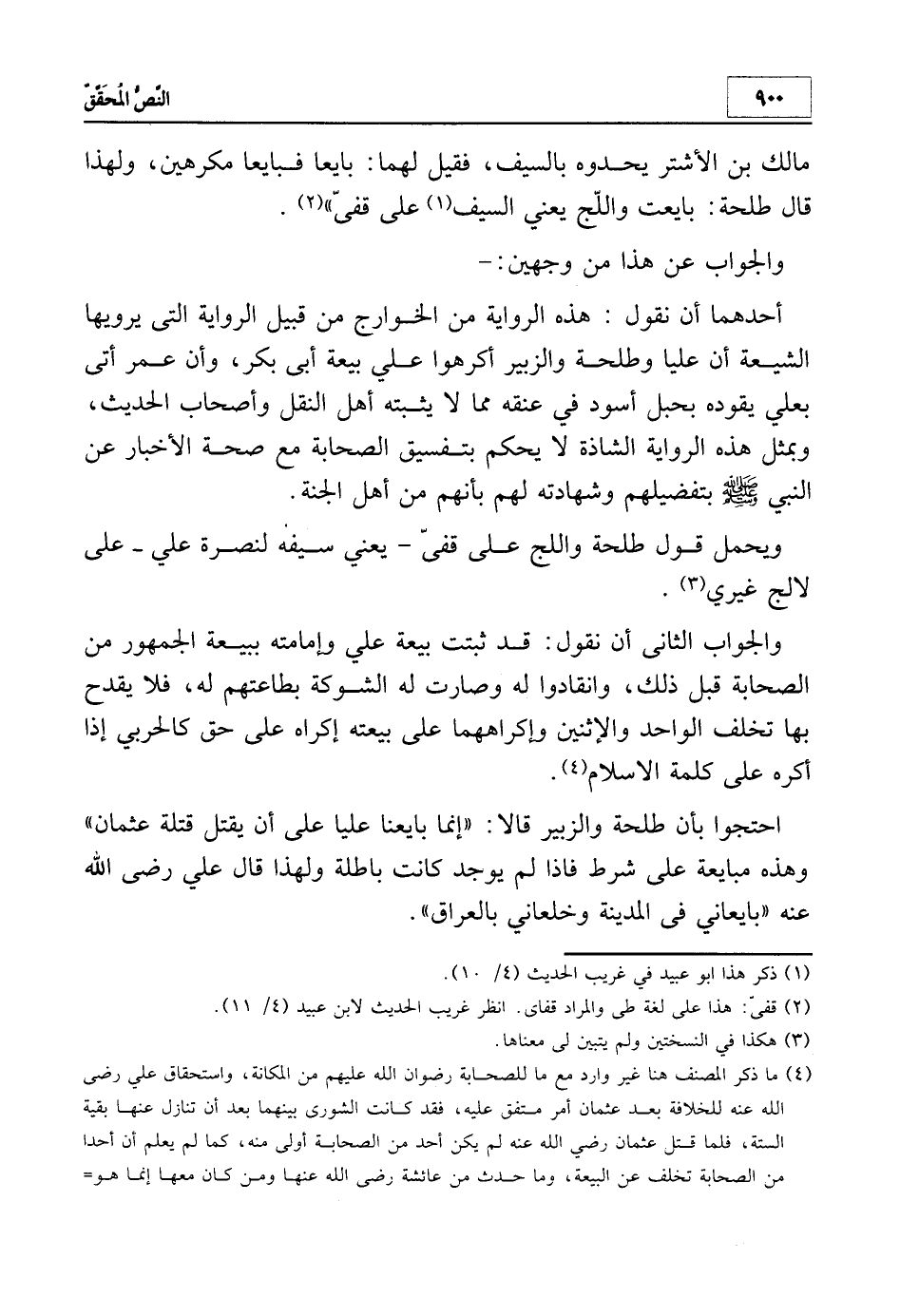 4 ما ذكر المصنف هنا غير وارد مع ما للصحابة - رضوان الله عليهم - من المكانة، واستحقاق علي - رضي الله عنه - للخلافة بعد ثمان أمر متفق عليه، فقد كانت الشورى بينهما بعد أن تنازل عنها بقية الستة، فلما قتل عثمان - رضي الله عنه - لم يكن أحد من الصحابة أولى منه، كما لم يعلم أن أحدا من الصحابة تخلف عن البيعة، وما حدث من عائشة - رضي الله عنها - ومن كان معها إنما هو مطالبة بقتلة عثمان الذين كان بعضهم في جيش علي - رضي الله عنه -، وكذلك ما وقع من معاوية - رضي الله عنه - لم يكن منازعة في الخلافة وإنما كان مطالبة بدم عثمان - رضي الله عنه -، مع أن الأمر كانت فيه فتنة عظيمة دخل فيها أصحاب الأهواء والأغراض فأكثروا الدس والكذب الذي تلبسه به الحق على بعض الناس والجميع كان مجتهدا. انظر: شرح العقيدة الطحاوية ص 545 - 547.