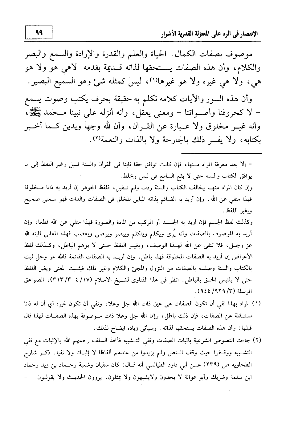 2 جاءت النصوص الشرعية بإثبات الصفات ونفي التشبيه فأخذ السلف - رحمه اللهم - بالإثبات مع نفي التشبيه ووقفوا حيث وقف النص ولم يزيدوا من عندهم ألفاظا لا إثباتا ولا نفيا. ذكر شارح الطحاوية ص (239) عن أبي داود الطيالسي أنه قال: "كان سفيان وشعبة وحماد بن زيد وحماد بن سلمة وشريك وأبو عوانة لا يحدون ولا يشبهون ولا يمثلون، يروون الحديث ولا يقولون كيف، وإذا سئلوا قالوا بالأثر". وقد تقدم ص 97 النقل عن الإمام أحمد في وقوفه مع النص أو مع قول الصحابة أو التابعين ونبذه للكلام. وقول المصنف هنا ولا يفسر ذلك بالجارحة من النفي المبتدع الذي لم يرد في القرآن والسنة فيجب العدول عنه إلى الألفاظ الشرعية التي تدل على الحق مع أمن اللبس من الاحتمالات الفاسدة التي تخالف الحق الثابت في الشرع، فإن لفظ الجوارح قد يحمل على أن المراد به ما يكتسب وينتفع به، فهذا معنى باطل، ولعل هذا مراد المصنف بنفي هذا عن الله عزوجل. وقد يقصد به الصفات الذاتية فنفيه يكون باطلا مخالفا للشرع، فلاختلاط الحق بالباطل في هذه الألفاظ وجب العدول عنها ونبذها واستخدام الألفاظ الشرعية السالمة من الاحتمالات الفاسدة.