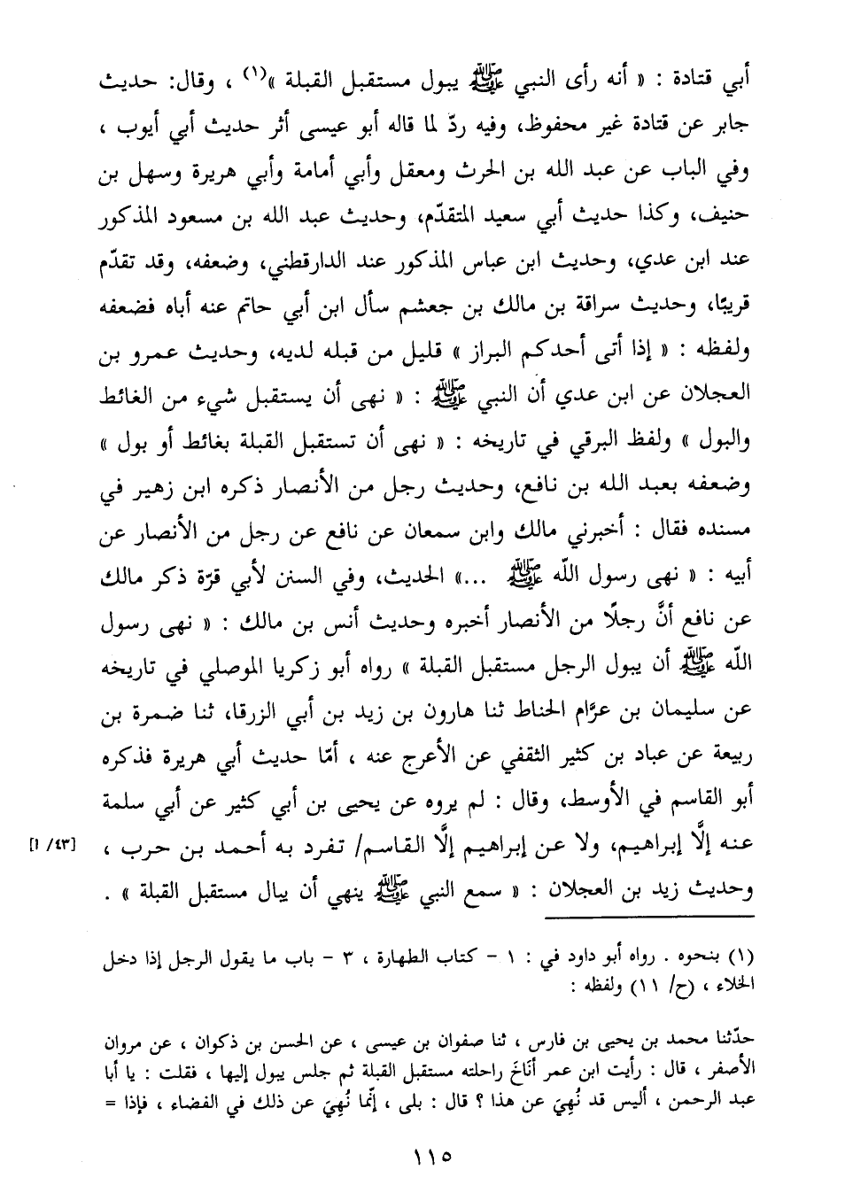 أبي قتادة:"أنه رأى النبي صَلَّى اللَّهُ عَلَيْهِ وَسَلَّمَ يبول مستقبل القبلة" (1) ، وقال: حديث