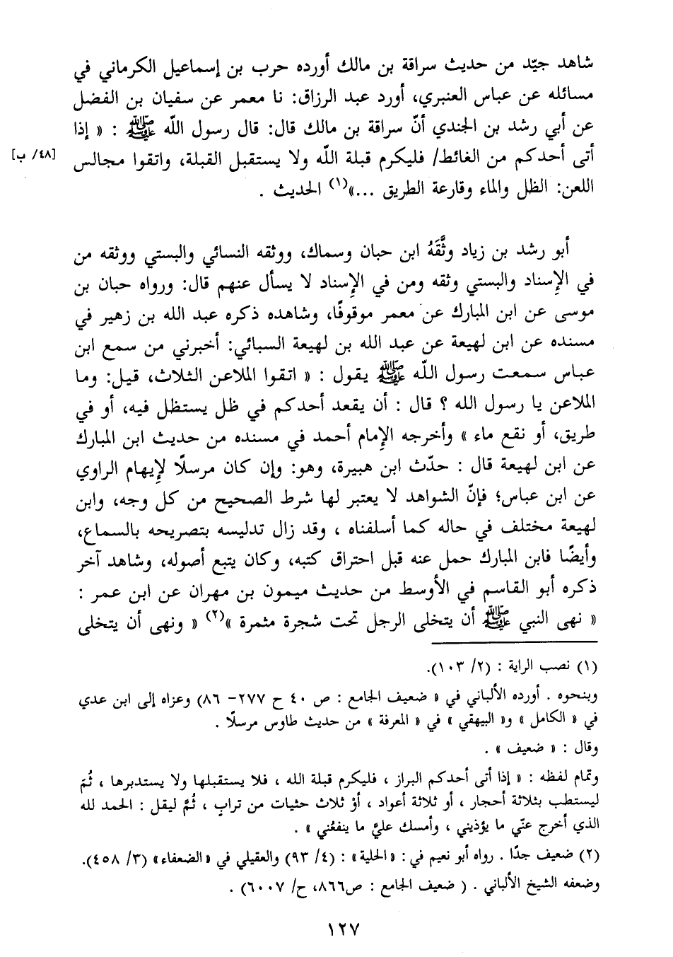 طريق، أو نقع ماء"وأخرجه الإِمام أحمد في مسنده من حديث ابن المبارك