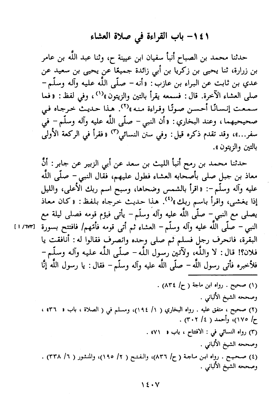 صلى العشاء الآخرة. قال: فسمعه يقرأ بالتين والزيتون " (1) ، وفي لفظ: " فما