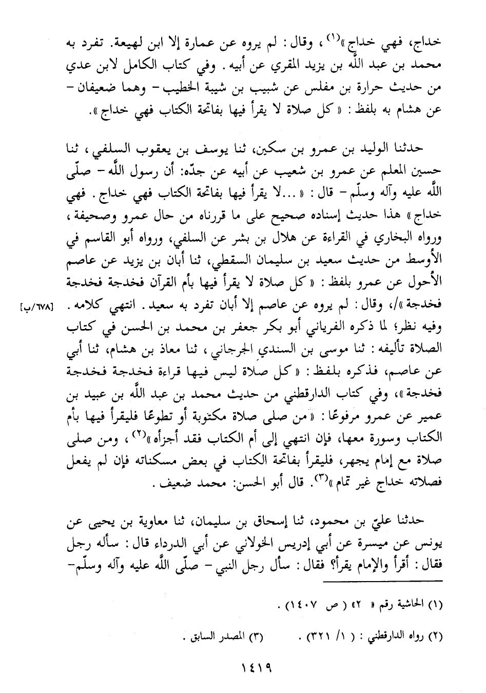 خداج " هذا حديث إسناده صحيح على ما قررناه من حال عمرو وصحيفة،