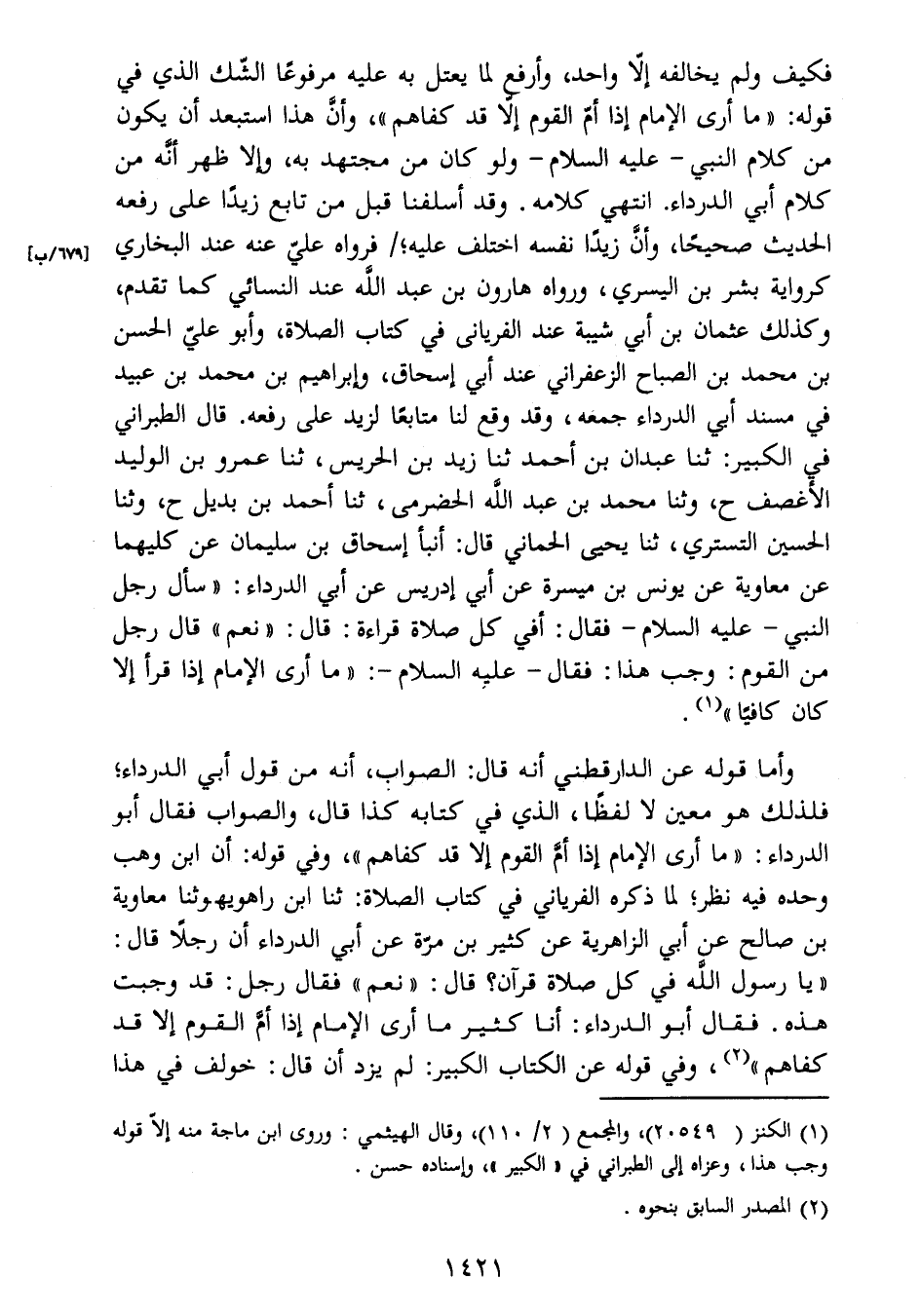 الدرداء: " ما أرى الإمام إذا أمَّ القوم إلا قد كفاهم "، وفي قوله: أن ابن وهب