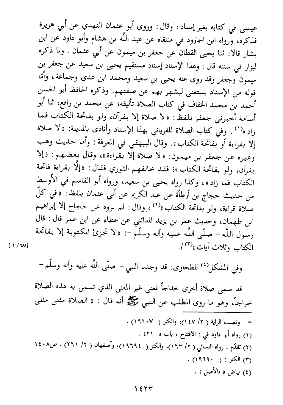 إلا بقراءة أو بفاتحة الكتاب ". وقال البيهقي في المعرفة: وأما حديث وهب
