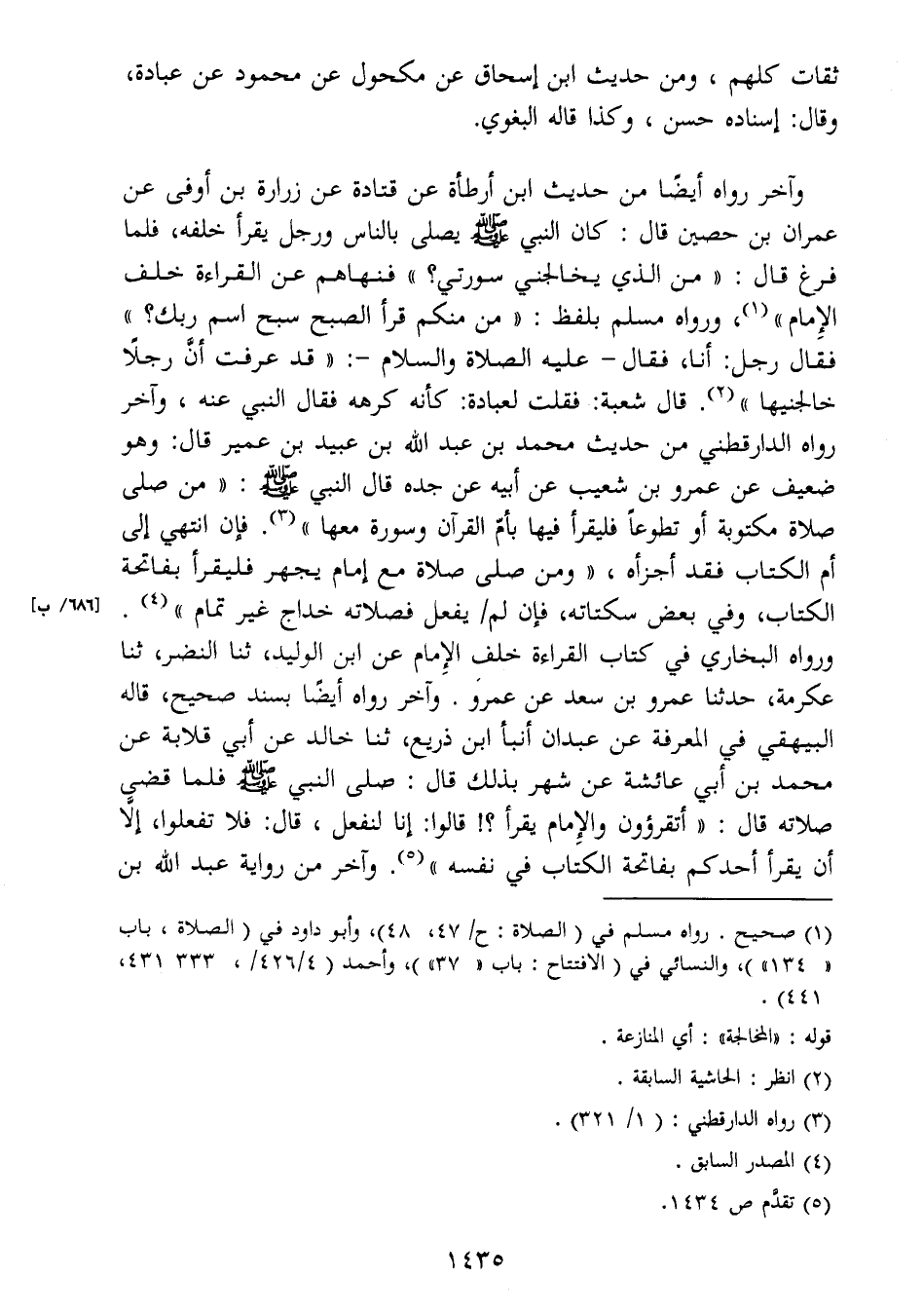 عمران بن حصبن قال: كان النبي صَلَّى اللَّهُ عَلَيْهِ وَسَلَّمَ يصلى بالناس ورجل يقرأ خلفه، فلما