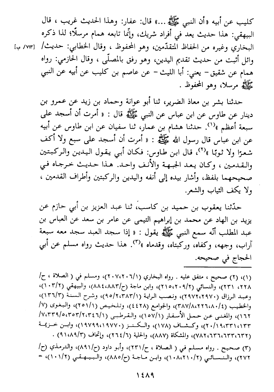 والقدمين، وكان يعد الجبهة والأنف واحد. هذا حديث خرجاه في