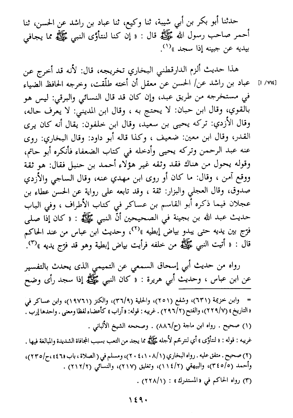 قال: " أتيت النبي صَلَّى اللَّهُ عَلَيْهِ وَسَلَّمَ من خلفه فرأبت بياض إبطيه وهو قد فرج يديه " (3) .