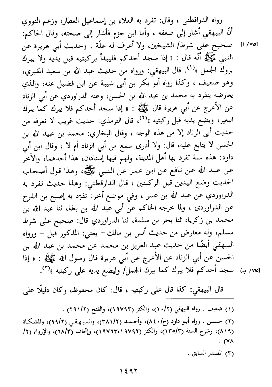 سجد أحدكم فلا يبرك كما يبمرك الجمل / وليضع يديه على ركبتيه " (3) .