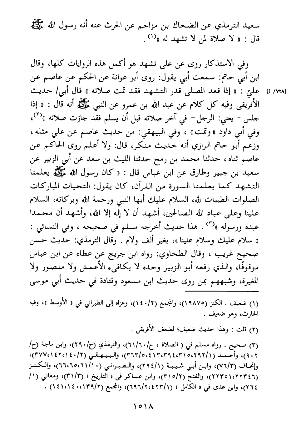 " سلام عليك وسلام علينا "، بغير ألف ولام. وقال الترمذي: حديث حسن