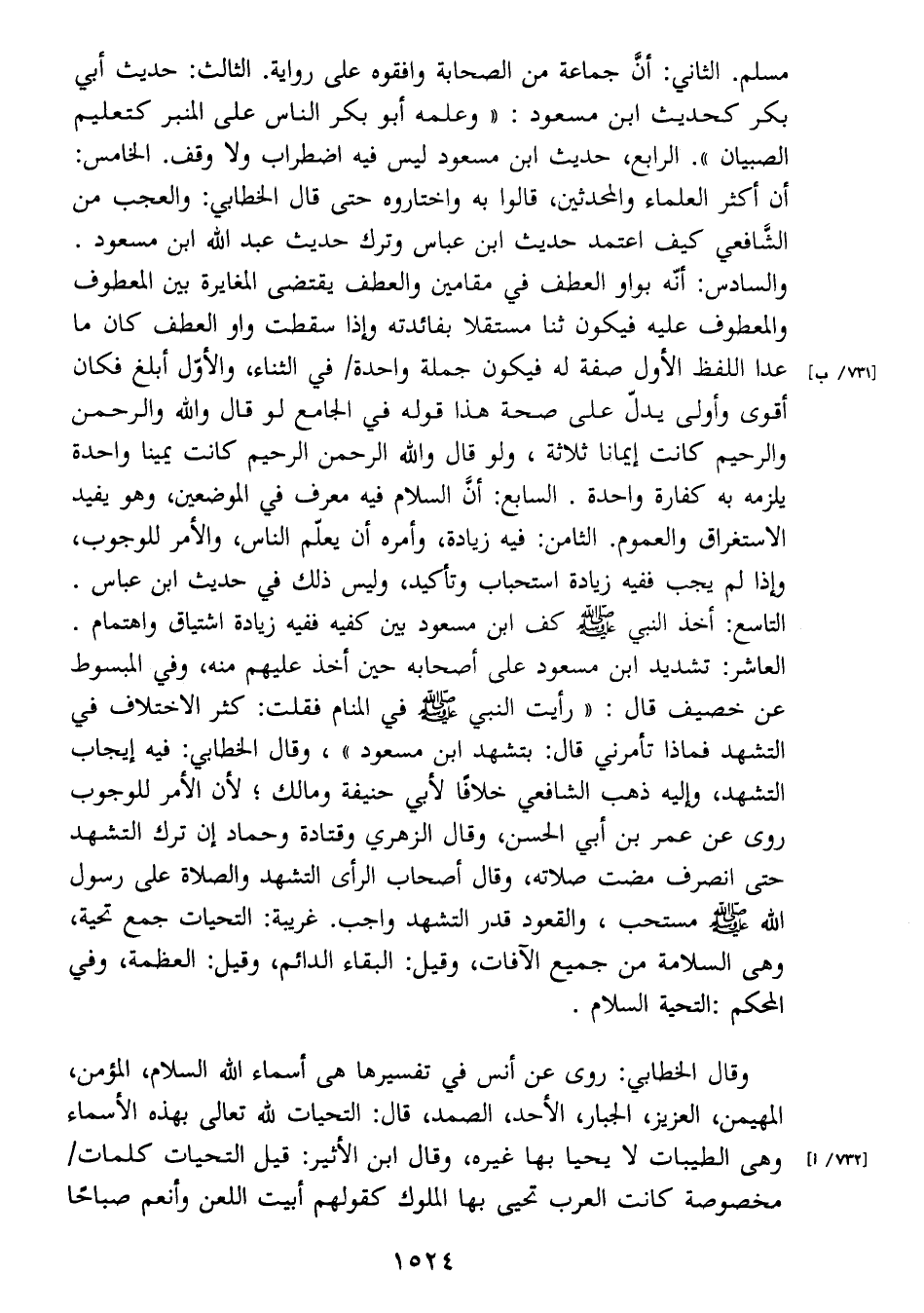 الله صَلَّى اللَّهُ عَلَيْهِ وَسَلَّمَ مستحب، والقعود قدر التشهد واجب. غريبة: التحيات جمع تحية،